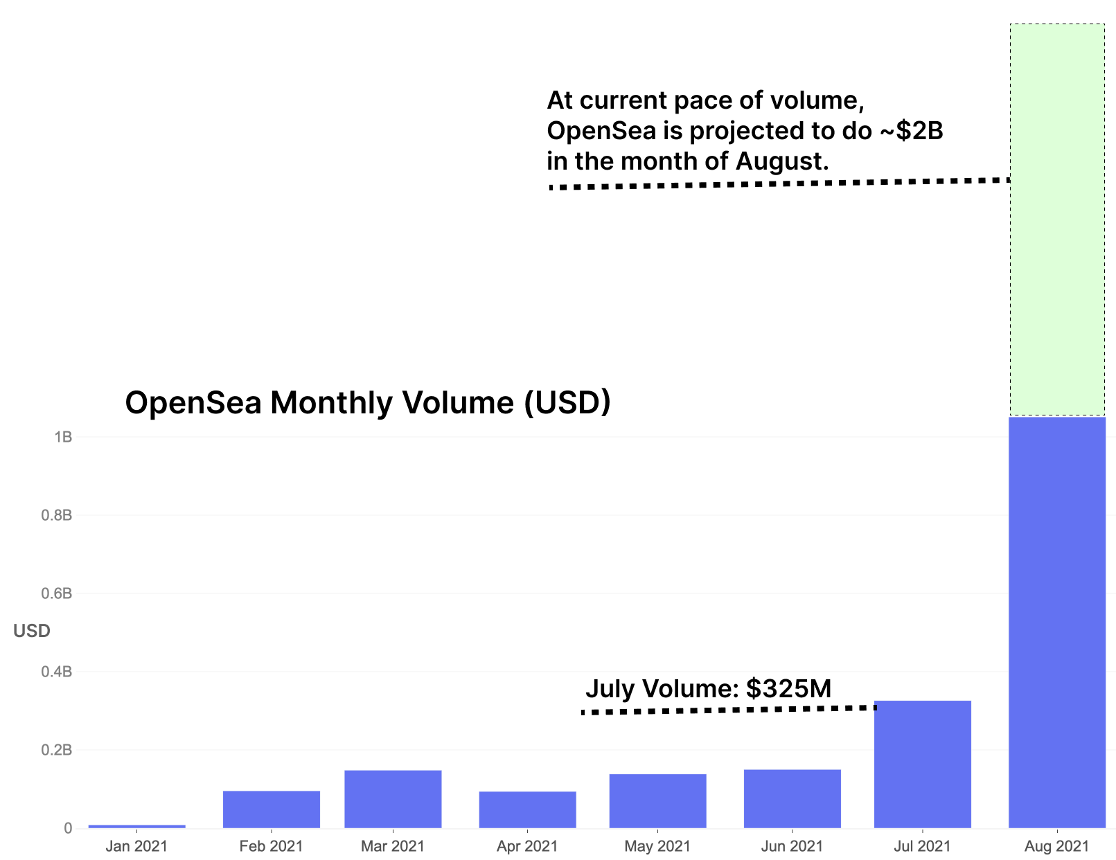 NFTs remain a leading narrative for Ethereum in the current market. In our introductory piece to NFTs we showed a projected OpenSea volume of $1B a few days into August. Half way through August the volume has already exceeded $1B.