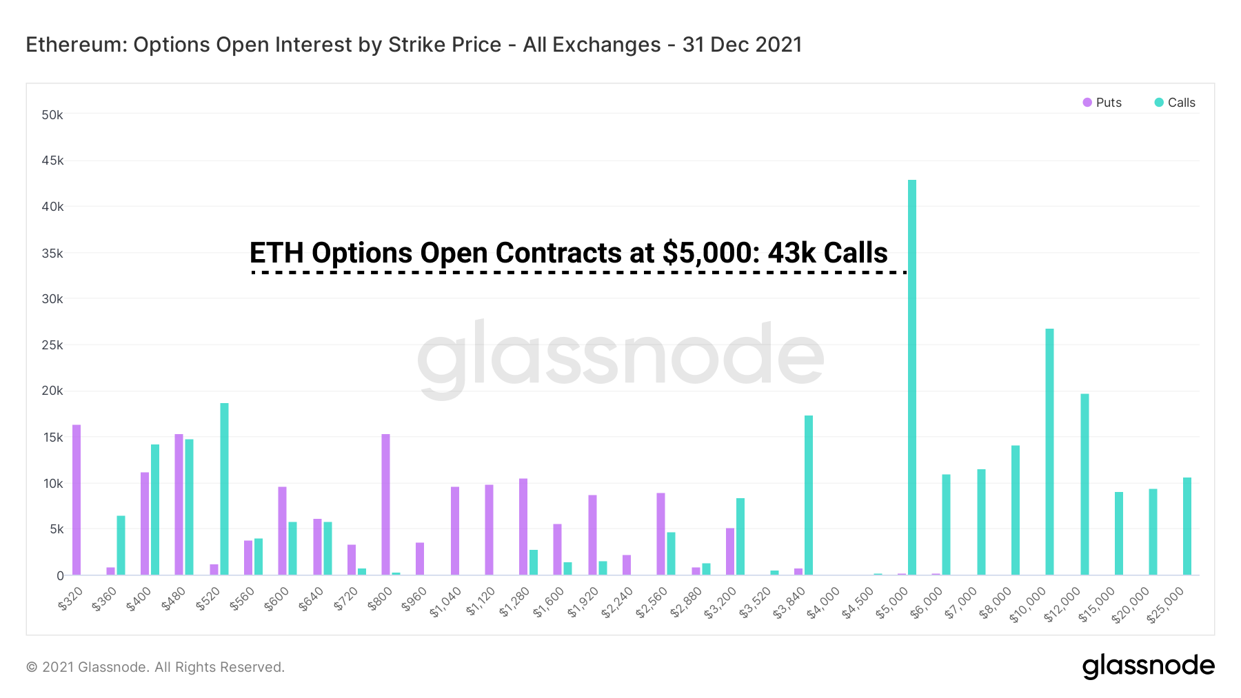 We can look to longer dated options with end of year expiration to get a view of what the options market expects of future price performance. We see a strong interest in out of the money (OTM) calls at the ETH $5,000 level for the end of year 31-Dec contracts. Over 43k call options are currently open at this strike and expiry, with non-trivial open interest also at ETH strike prices in excess of $10k.