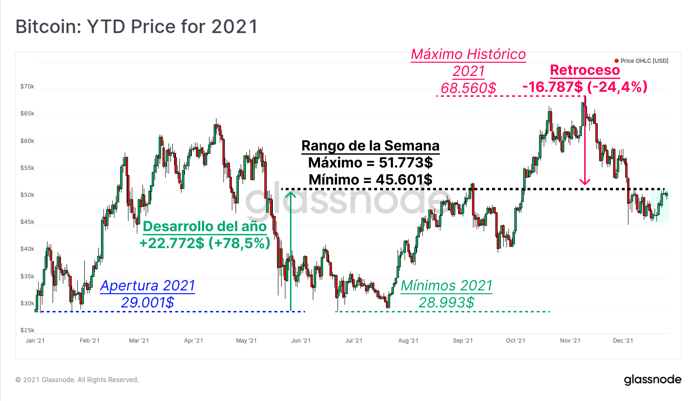 El mercado de Bitcoin opera tan sólo ligeramente al alza en esta temporada de festividades de final de año. La semana abrió en los mínimos de la consolidación en los 45.601$, antes de emprender la marcha hacia los máximos locales, llegando a alcanzar los 51.773$.