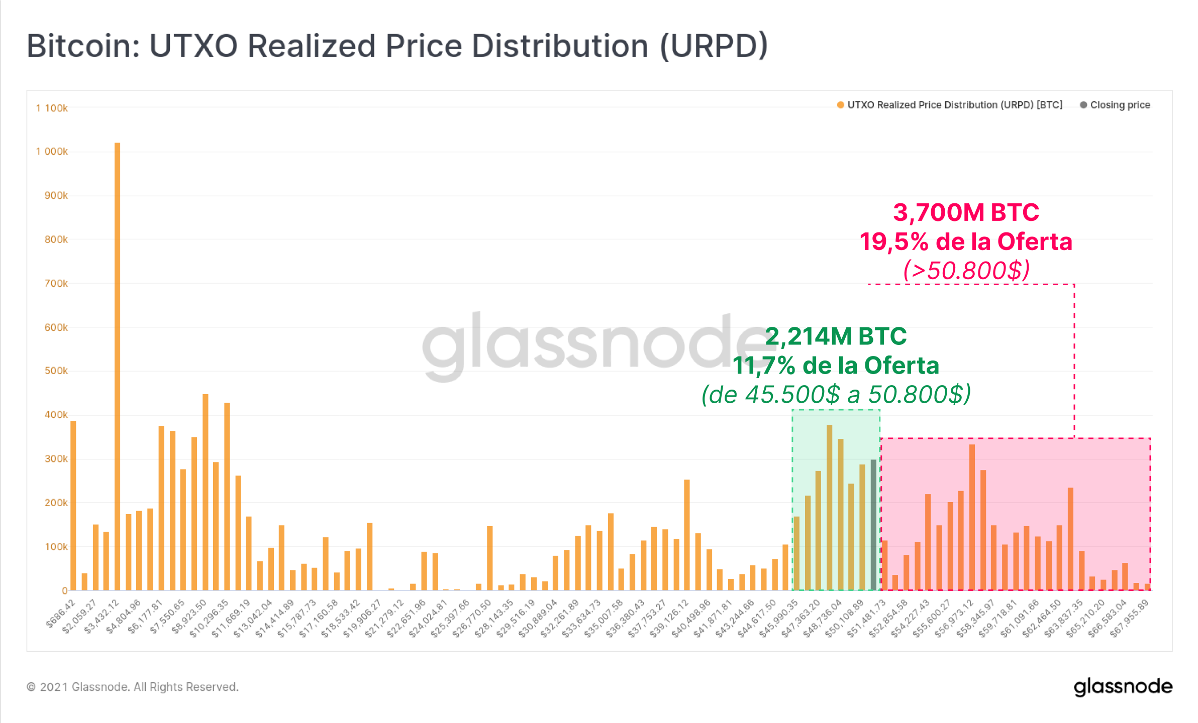 Un apunte más constructivo es que una aglomeración de volumen razonablemente grande se ha establecido dentro del rango de precios de esta semana, equivalente a 2,214M BTC (11,7% de la oferta). Esto indica que se ha movilizado un grado de demanda nada desdeñable durante la consolidación, con una gran proporción de monedas cambiando de manos entre los 45.000$ y los 50.000$.
