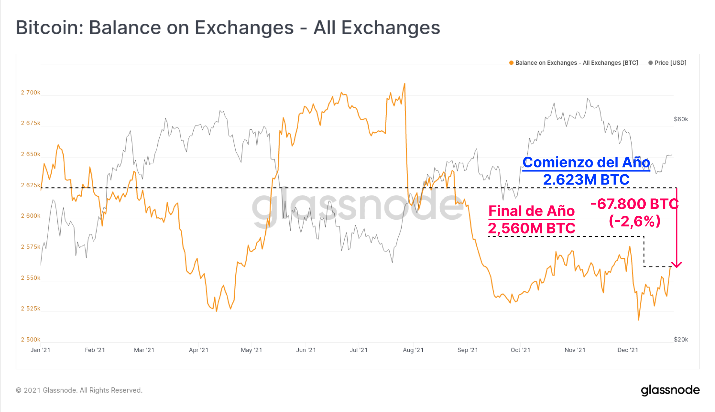 - Los balances de los exchanges han sufrido unos retiros anuales netos por valor de 67.800 BTC, un descenso de apenas el 2,5%.