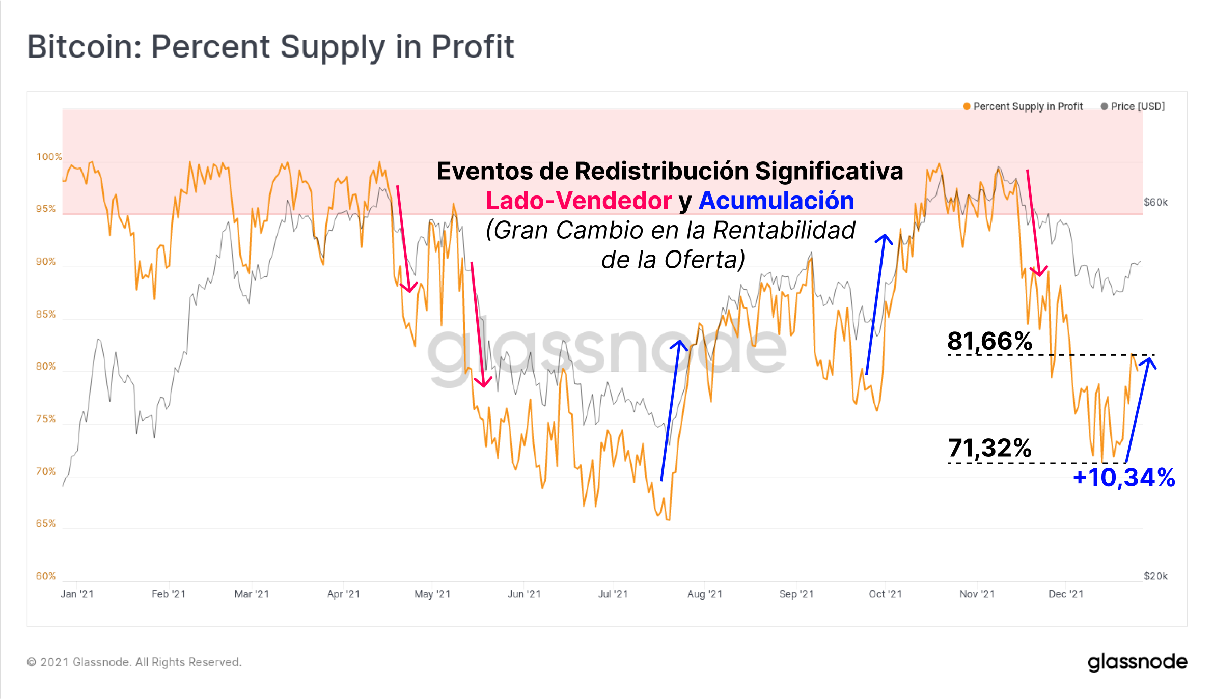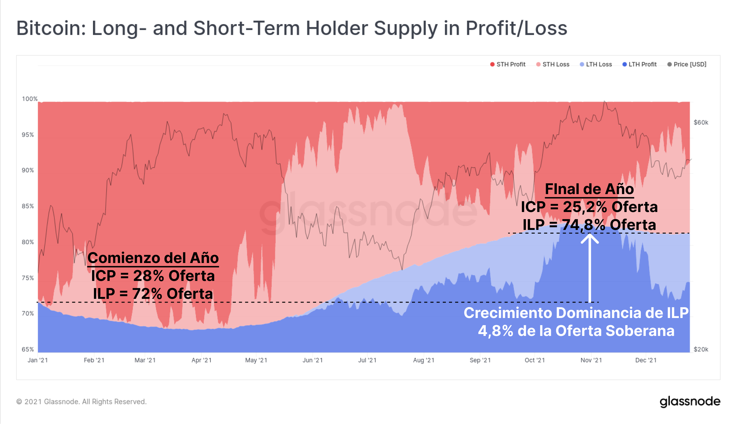 Este modesto traspaso de patrimonio de los Inversores a Corto Plazo a los Inversores a Largo Plazo, todo a pesar de haber impreso múltiples máximos históricos, sugiere que este 2021 se define mejor como una macro consolidación, a la vez que un periodo de modesta acumulación. Este comportamiento es típicamente observable en el blockchain durante los mercados bajistas de Bitcoin, los que en retrospectiva son largos periodos de distribución monetaria que pasa de aquellos con manos más débiles, a los más fuertes y con gran convicción a largo plazo.