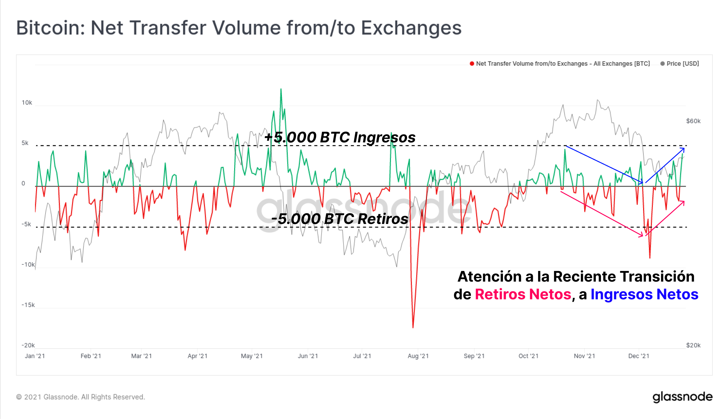 Es un comportamiento que podemos observar más claramente en el Volumen Neto de entrada/salida de los exchanges, que ha oscilado durante todo el 2021 en ±5.000 BTC. De hecho en el transcurso de esta última semana, hemos visto un nuevo cambio de tendencia, de retiros netos de vuelta a ingresos netos. En el futuro más inmediato, esto es algo a lo que tenemos que prestar atención para ver si la tendencia se suaviza, o se torna más prominente mientras nos acercamos al nuevo año.