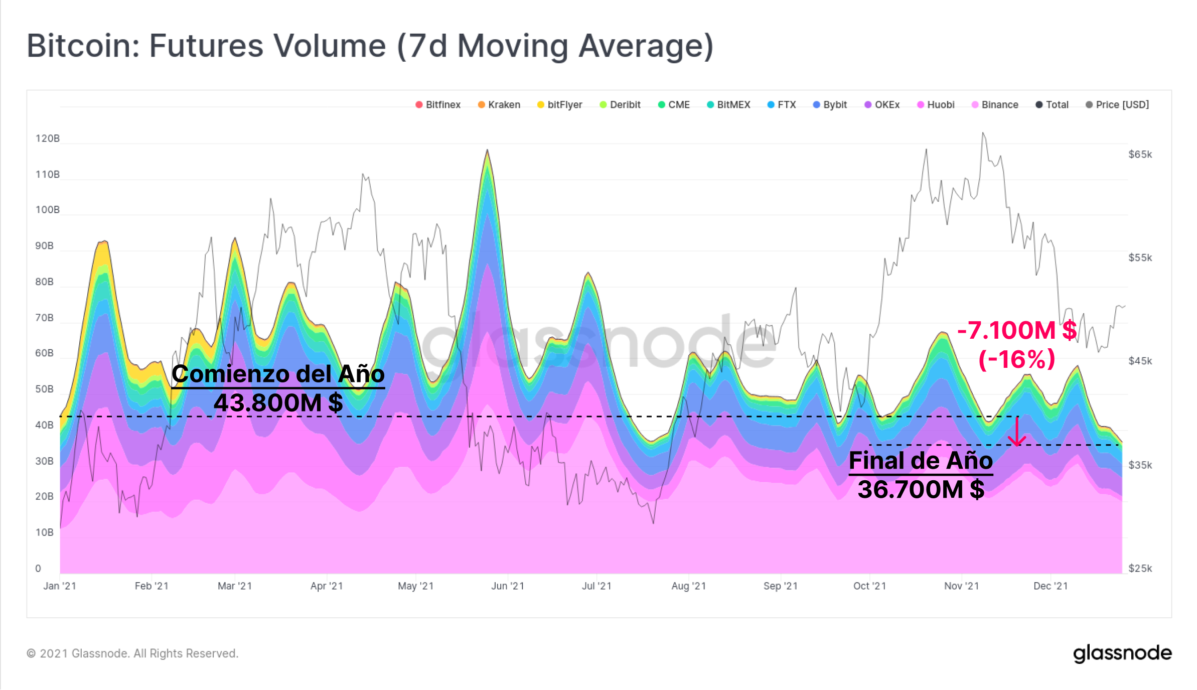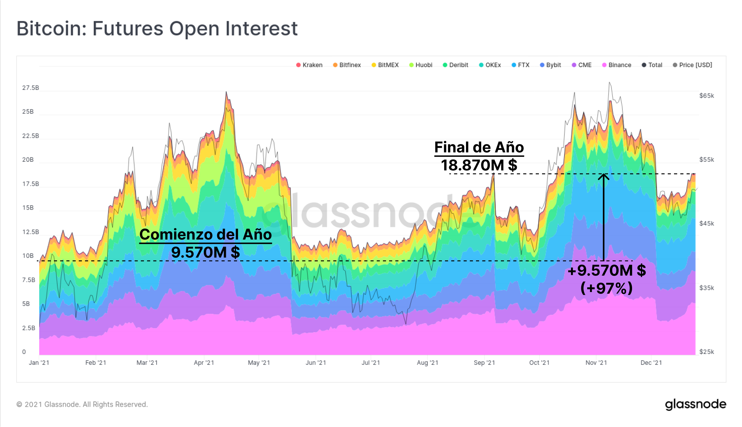 Bitcoin cierra el año habiendo crecido un 78%, y habiendo experimentado un tumultuoso y volátil 2021. Aportamos una macro evaluación de este año 2021 a lo largo del espacio del blockchain, los exchanges, los mercados de derivados y los mercados mineros.