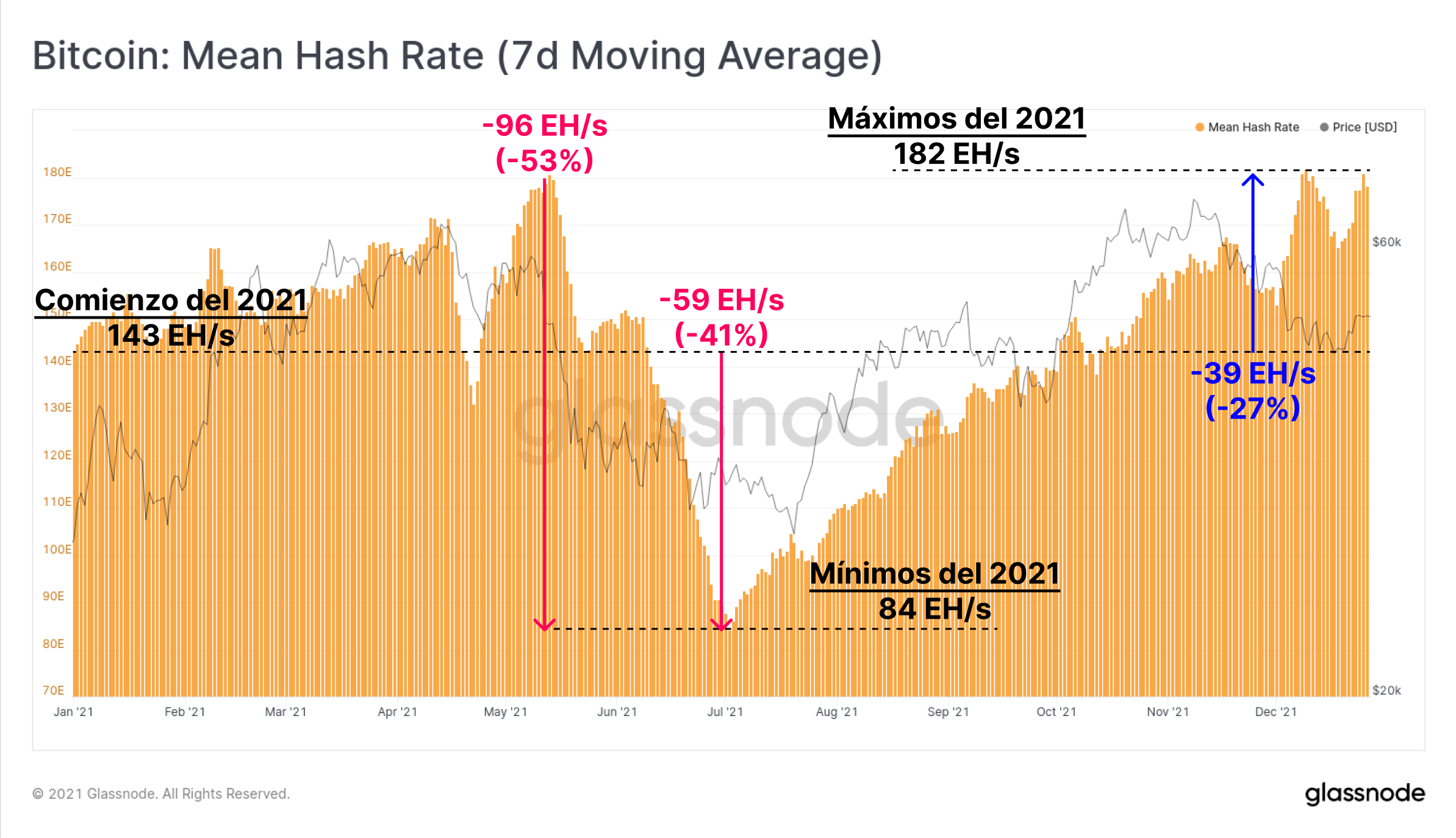 - El hash-rate minero cierra habiendo subido un 27% este año, tras recuperarse enteramente de la gran migración en la que en torno al 53% de la fuerza minera se desconectó prácticamente de la noche a la mañana.