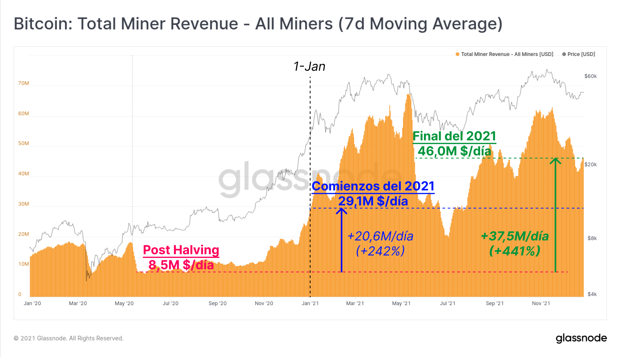 - 29,1M $/día a comienzos del 2021, un aumento del 242% desde el halving.