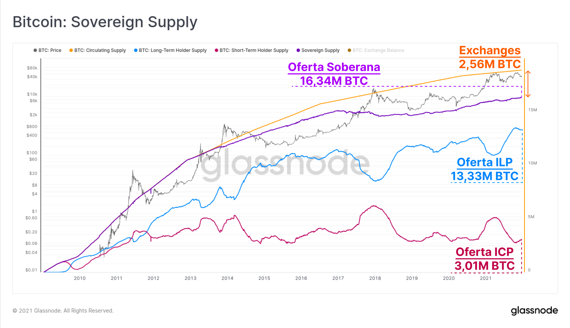 - La Oferta Soberana, definida como todas aquellas monedas almacenadas fuera de las reservas de los exchanges, alcanza ahora su máximo histórico en los 13,34M BTC.