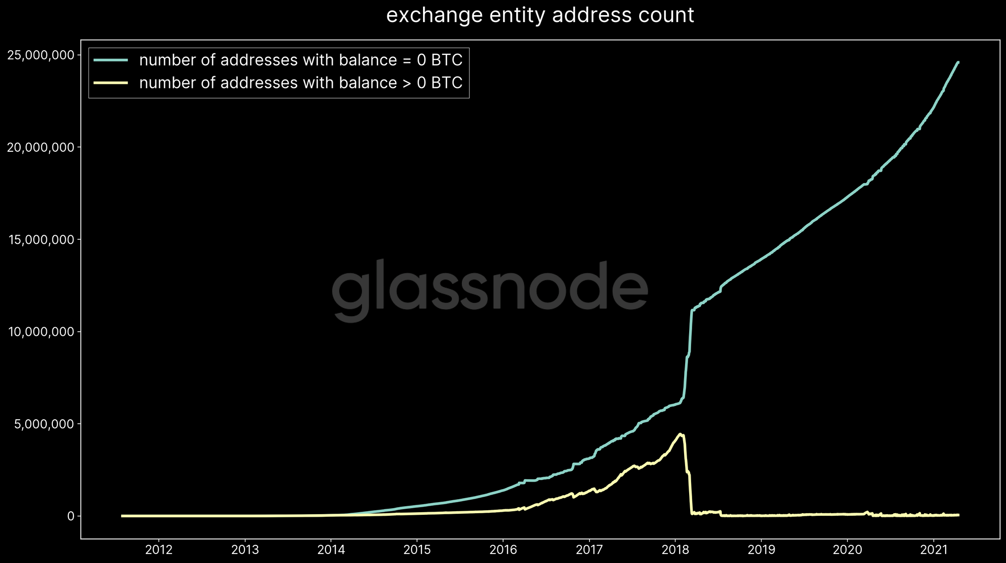 For instance, Figure 2 shows the number of network addresses associated with a specific exchange. It illustrates the continuous growth of the exchange cluster, currently at almost 25 million addresses. Note that the bulk of those addresses are empty, while the number of addresses with a non-zero balance has remained at a level below 100,000. This is just one example of the highly dynamic nature of ever-changing exchanges wallets.
