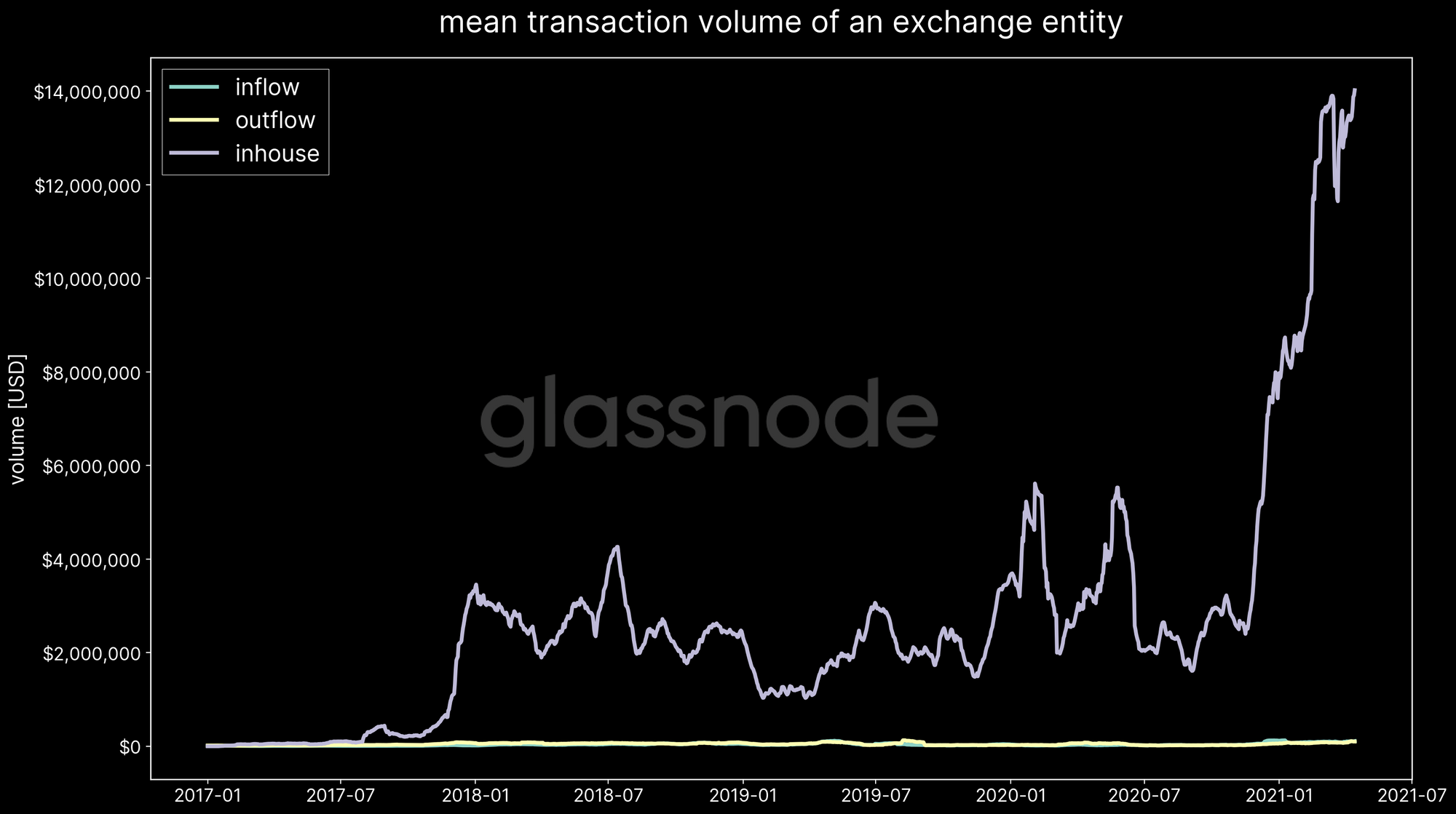 On-chain exchange data can be imperfect at times – at least on a single-transaction level. Some amount of uncertainty remains, as misses, or false alarms with respect to a particular in or outflow to/from an exchange are possible. Even though we have advanced methodologies in place, at times it can be impossible to immediately detect the sudden creation of a new cold wallet (an address that is seen in the network for the first time) that receives internal funds from another known exchange address. Many heuristics are only triggered once certain activity and patterns emerge over time. Note that this holds especially for sudden large transactions – the average transaction size moved inhouse by exchanges is often significantly higher than in and outflows (Figure 3).