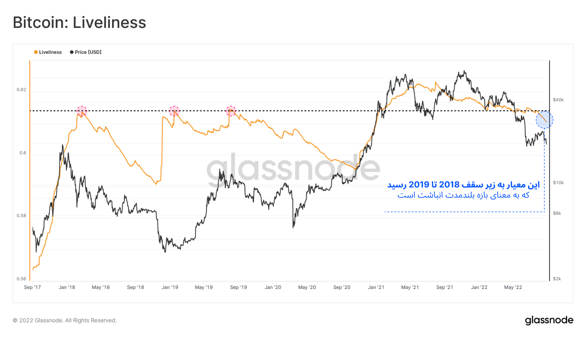 برای مشاهده رفتار بلندمدت بیتکوین، ابتدا معیار Liveliness را ارزیابی خواهیم کرد.