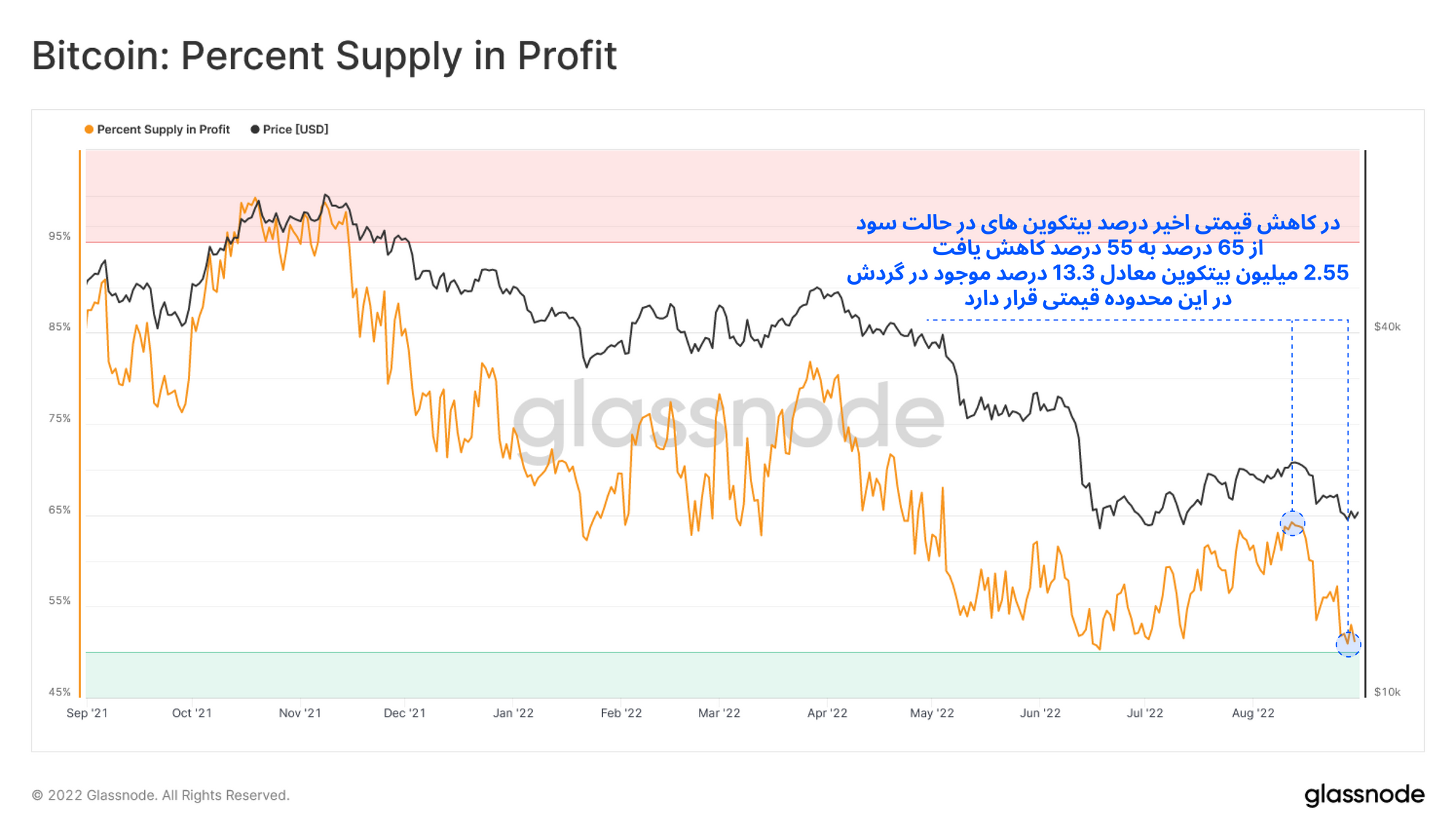 اگر میزان موجودی بیتکوینهای در حال سود را در دو قیمت مشخص شده در نمودار زیر با یکدیگر مقایسه کنیم، میزان بیتکوین هایی که در این رنج قیمتی قرار گرفتهاند مشاهده خواهیم کرد.