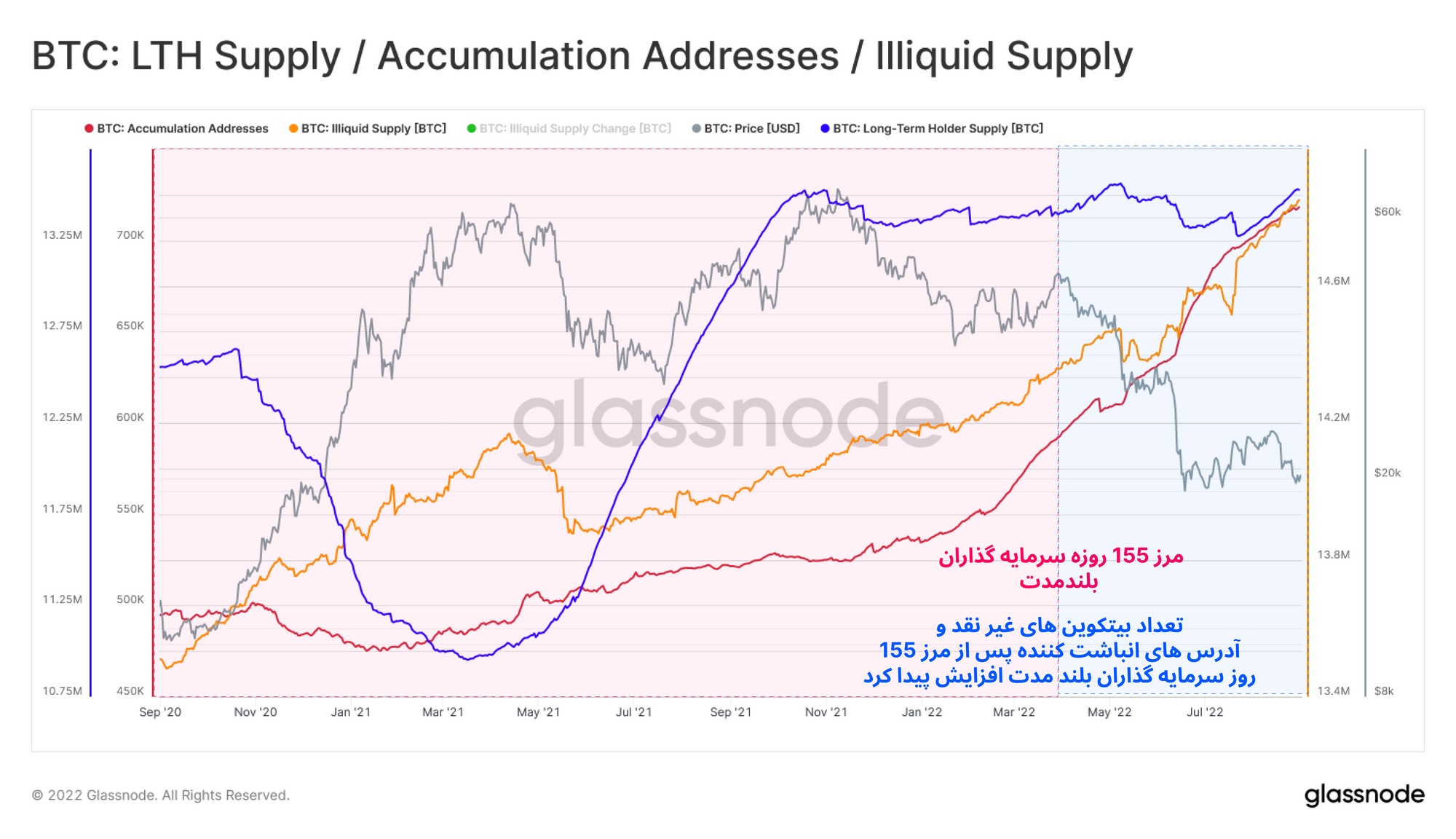 آدرسهای انباشت کننده نیز آدرسهایی هستند که بیش از دوبار به آنها بیتکوین واریز شده ولی تا به حال موجودی آنها خرج نشده است. طبق نمودار زیر افزایش ناگهانی آدرسهای انباشتکننده و بیتکوینهای غیر نقد تقریباً همزمان با آغاز عمر بیتکوینهای بلندمدت رخ داداند و از آن زمان تا کنون به سقف جدید خود رسیدهاند.
