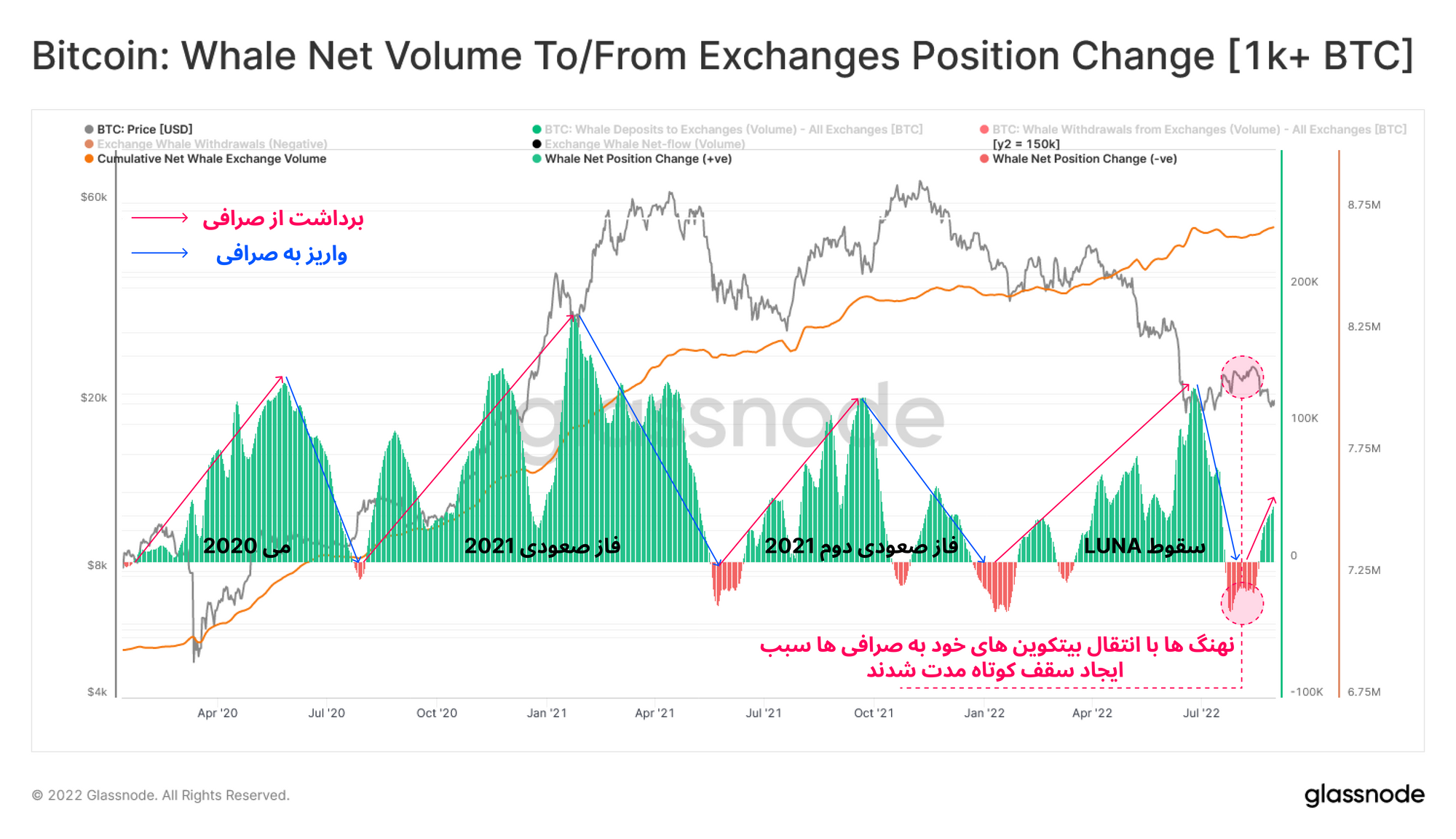 · مقادیر مثبت این معیار (🟢) موجودی بیتکوین نهنگها افزایش پیدا میکند ( از صرافی برداشته میشود)