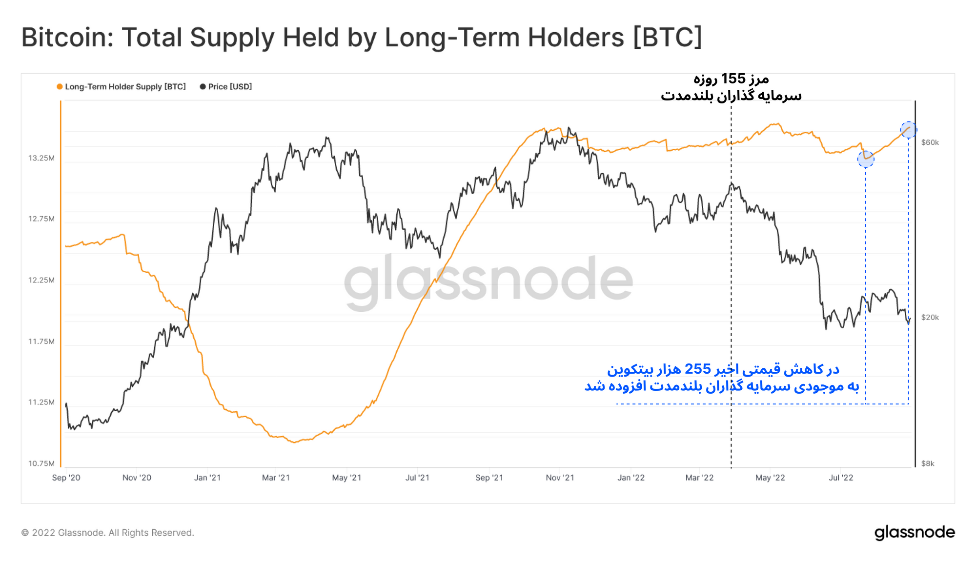 عمر بیتکوینهای سرمایهگذاران بلندمدت حداقل از ۱۵۵ روز پیش، یعنی ماه آوریل ۲۰۲۲ آغاز شده است. عمر این بیتکوینها در فاز دومی که در بخش قبل به آن اشاره شد، در قیمت ۴۶ هزار دلار و درست قبل از سقوط LUNA آغاز شده است.