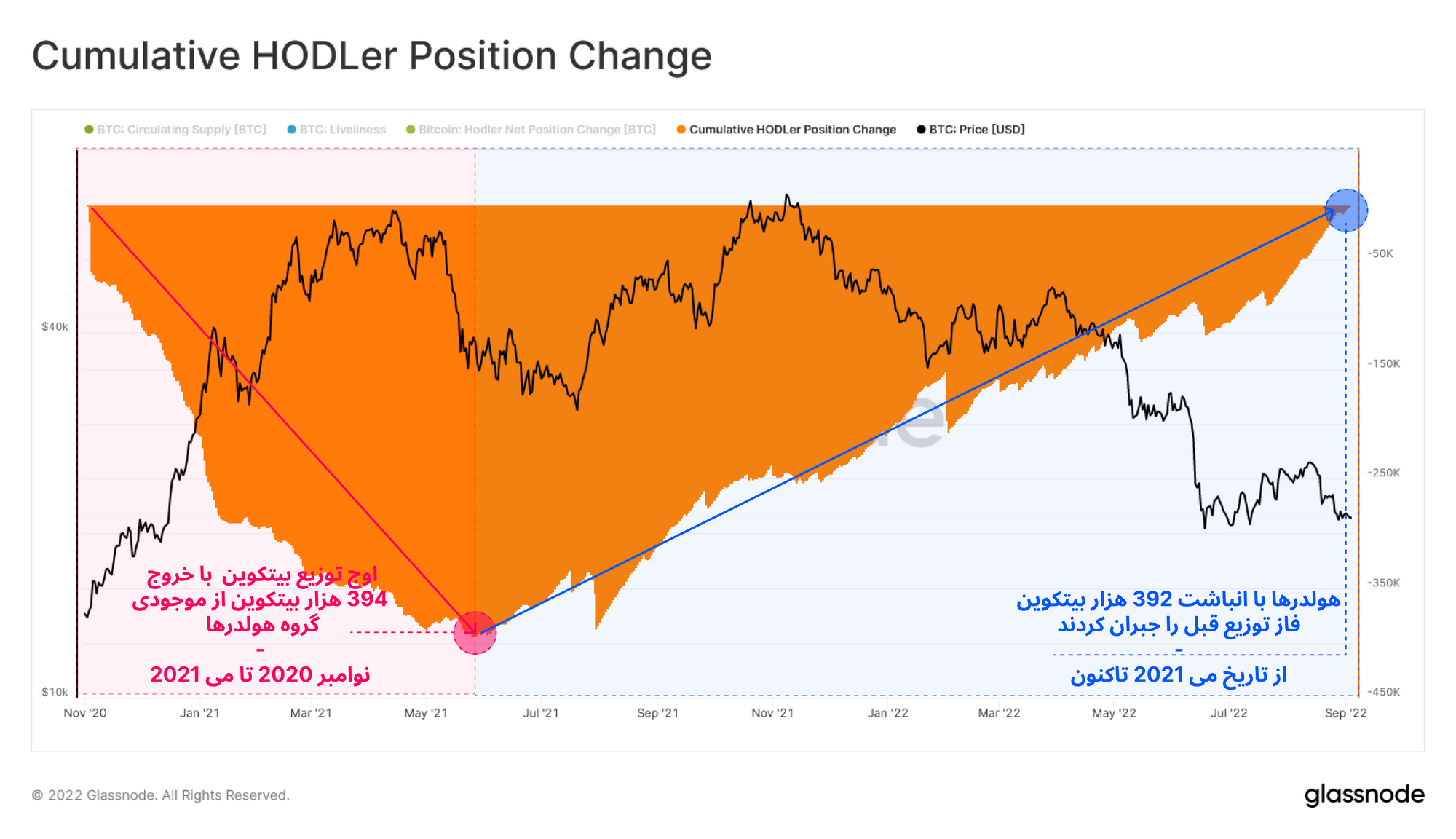 · میزان توزیعی که در این بازه زمانی صورت گرفته به وسیلهی میزان انباشتی که هولدرها از نیمهی دوم ۲۰۲۱ تا کنون انجام دادند، متعادل میشود. در حال حاضر ماهانه ۷۰ هزار بیتکوین انباشت میشود و این مقدار بیتکوین انباشت شده از مارس ۲۰۲۰ بیسابقه است.