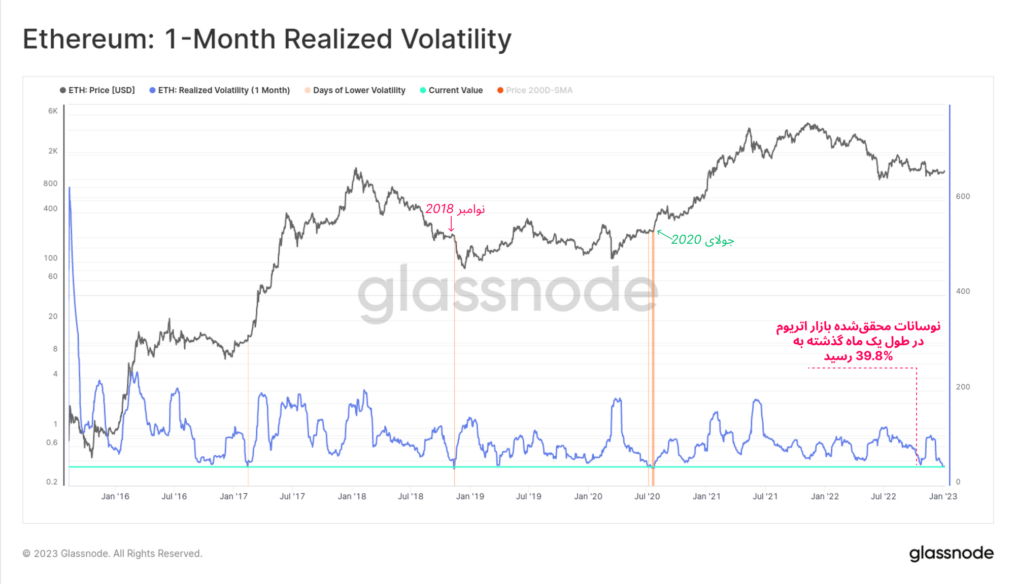 در بازار اتریوم تعداد موارد کمنوسان بسیار کمتری مشاهده میشود که نوسانات آن همانند یک ماه گذشته تا ۳۹.۸ درصد کاهش داشته باشد. در نمودار مشاهده میکنیم که دوران کمنوسان بازار اتریوم نیز به حرکات هیجانی بسیار چشمگیری ختم شده است که میتوان نوامبر ۲۰۱۸ (کاهش ۵۸ درصدی قیمت) و جولای ۲۰۲۰ (فاز صعودی ۲۰۲۰-۲۰۲۱) را به عنوان نمونه مشاهده کرد.