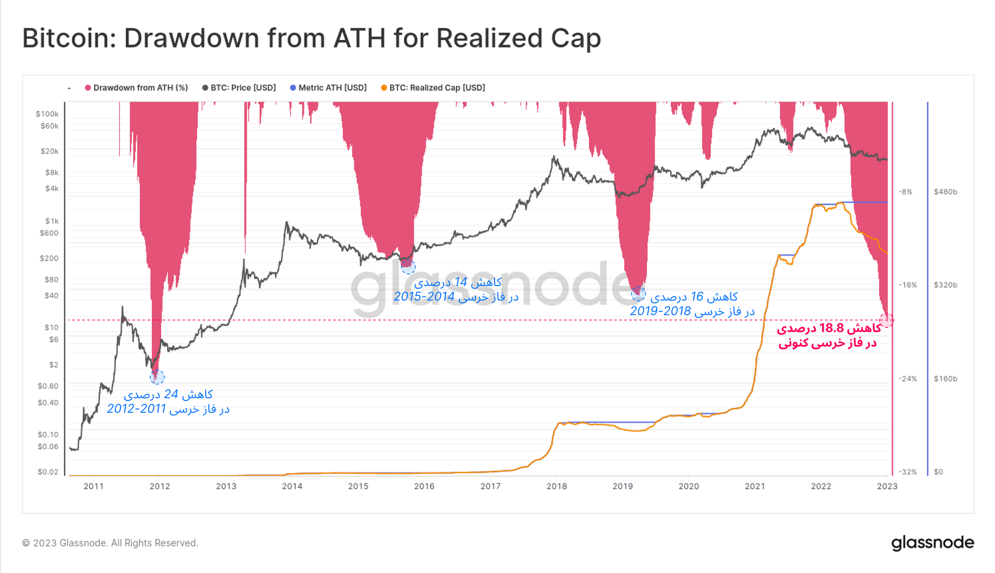 · کاهش حجم پول حقیقی (Realized Cap) بازار در سال ۲۰۲۲ که از نظرحجم سرمایههای از دست رفته، سال ۲۰۲۲ را به یکی ازعمیقترین چرخههای خرسی در تاریخ بیتکوین تبدیل کرد.