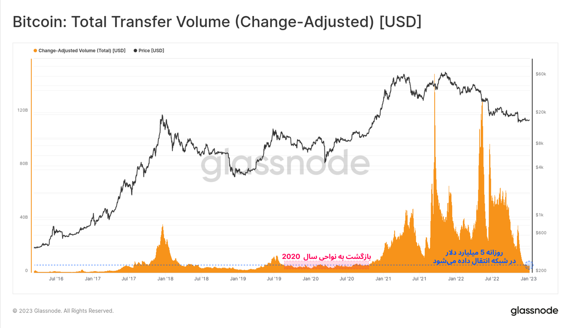 اکنون با دقت به چرخههای قبل متوجه خواهیم شد که حجم دلاری مبادلات در شبکه بسیار به دوران قبل از فاز صعودی سال ۲۰۲۰ نزدیک و نمایانگر خروج سرمایهگذاران بزرگ از بازار است.
