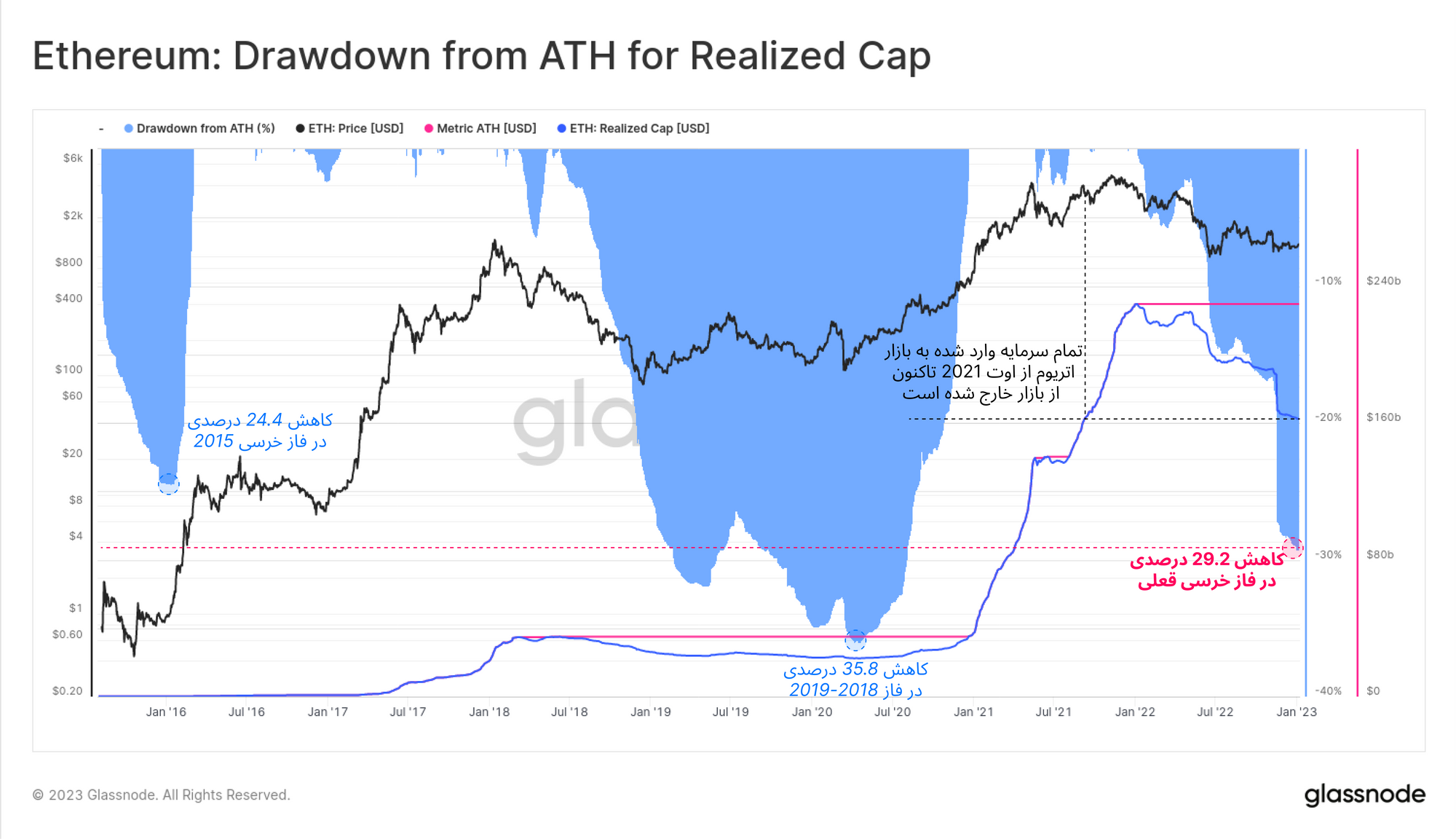 بازار اتریوم دچار کاهش بیشتری در Realized Cap خود شده و یا به اصطلاح پول حقیقی بیشتری از دست داده است؛ به طوری که از ژانویه ۲۰۲۲ تاکنون، حدود ۲۹.۲ درصد از Realized Cap اتریوم کاهش پیدا کرده است. سرمایهگذاران اتریوم طی سال ۲۰۲۲ در معاملات خود مجموعا و به طور خالص ۶۷.۱ میلیارد دلار ضرر نقد کردهاند.
