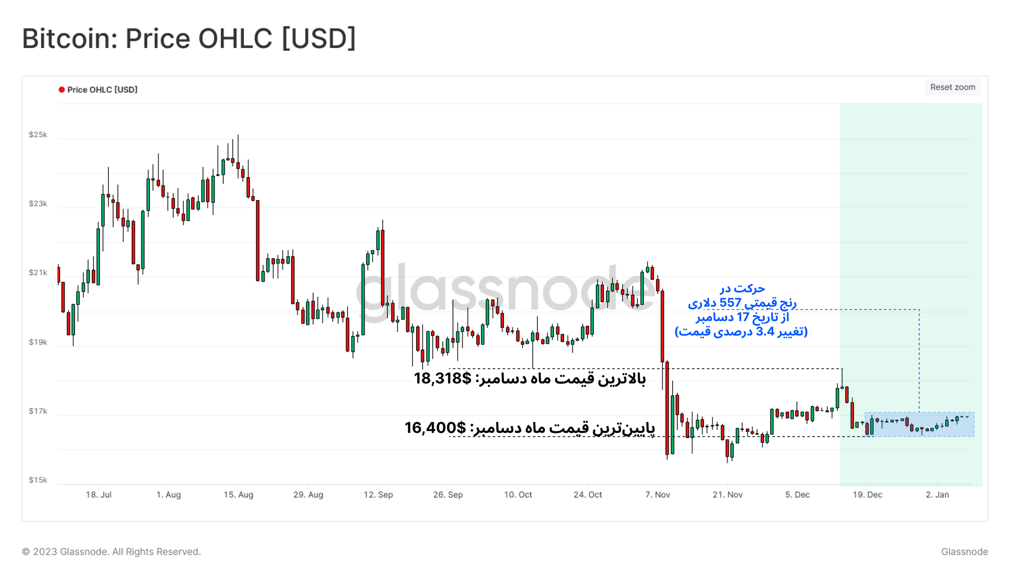 بیتکوین در حرکتی بسیار نادر بیش از ۳ هفته متوالی در محدودهی قیمتی بسیار تنگاتنگ حرکت کرده و در این مدت زمان تنها ۵۵۷ دلار تغییر قیمت داشته است. در طول چند هفته اخیر بالاترین قیمت ۱۶.۹ هزار دلار و پایینترین قیمت ۱۶.۴ هزار دلار ثبت شده است. البته تمام بازارهای سنتی دیگر معمولاً پایان سال را به آرامی میگذرانند و بازار ارزهای دیجیتال نیز از این قاعده مستثنی نیست.