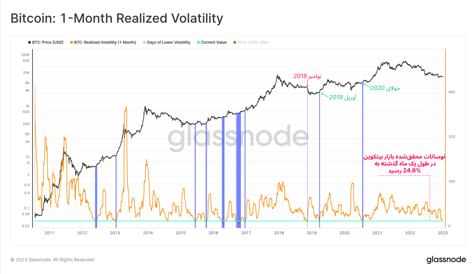 گرچه نوسانات بازار بیتکوین میان بازارهای دیگر به افسارگسیختگی شهرت دارد، اما در تعطیلات سال نو در این بازار خبری از نوسانات شدید نبود و چند هفته اخیر به دور از هیجانات و به آرامی سپری شد. در یک ماه گذشته نوسانات محققشده بازار به محدوده کف چندین ساله، یعنی تا ناحیه ۲۴.۶ درصد کاهش داشت. به طور کلی نوسانات محقق شده به نوساناتی گفته میشود که تاکنون در بازار رخ داده و یا به اصطلاح محقق شده است. همانطور که در این نمودار مشاهده میکنید نقاطی که با رنگ آبی مشخص شده، نواحی را نشان میدهد که بازار در گذشته نیز همانند محدوده فعلی در ناحیهای بسیار کمنوسان قرار گرفته بوده است. با توجه به خطوط آبی، اغلب این موارد به صعود قیمت ختم شده و تنها در ماه نوامبر ۲۰۱۸، نوسانات ضعیف بیتکوین، افت شدید قیمت را به دنبال داشته است. این موارد عبارتند از: