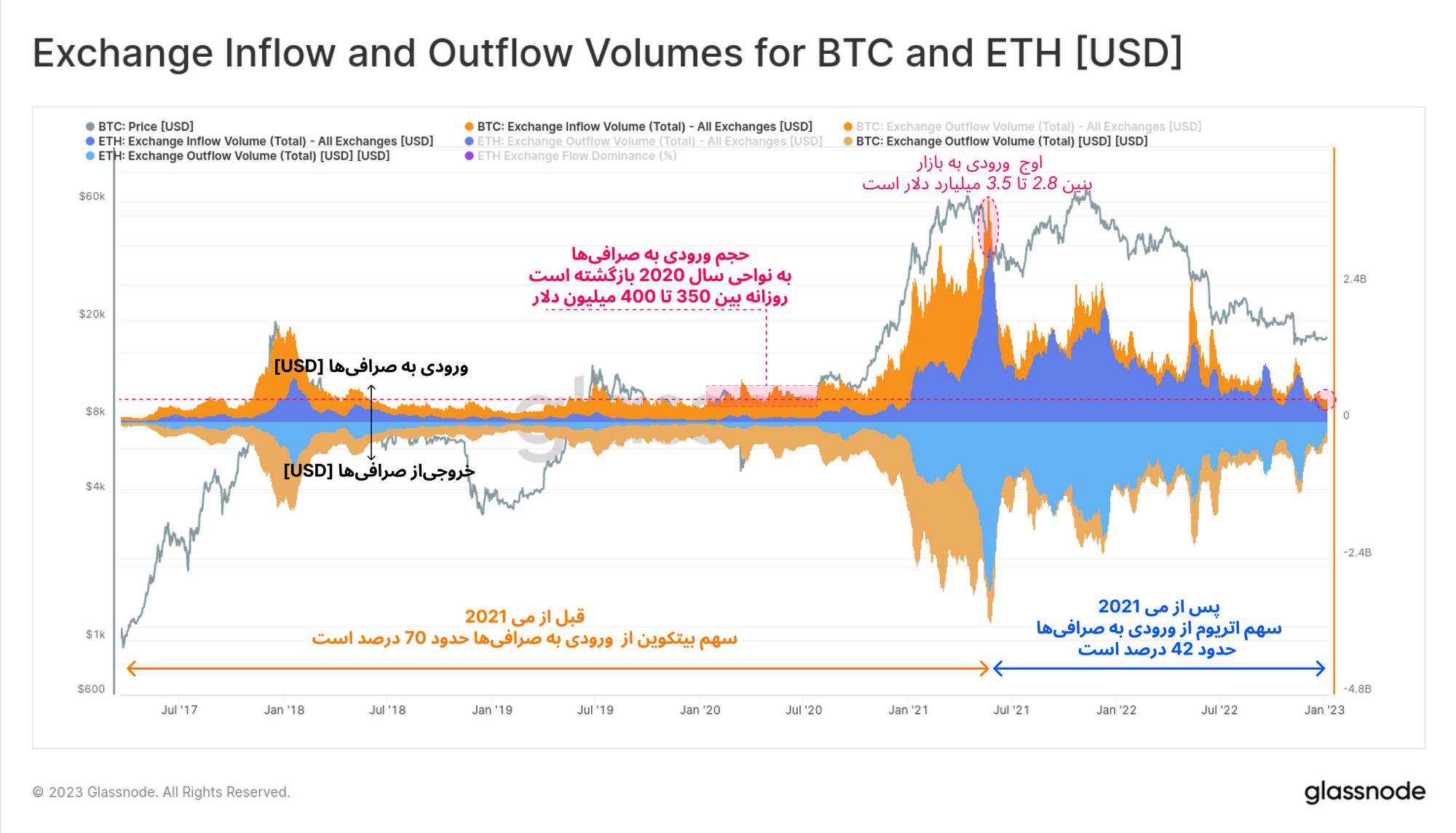 در حال حاضر حجم دلاری ورود بیتکوین به صرافیها روزانه بین ۳۵۰ میلیون دلار تا ۴۰۰ میلیون دلار است و اختلاف بسیاری با حجم ورودی چندین میلیارد دلاری مشاهده شده در فاز ۲۰۲۱-۲۰۲۲ دارد. همچنین باید توجه داشت که سهم ورودی اتریوم به صرافیها از ماه می ۲۰۲۱ حدود ۳۰ درصد بوده و اکنون این سهم به ۴۲ درصد افزایش پیدا کرده است.
