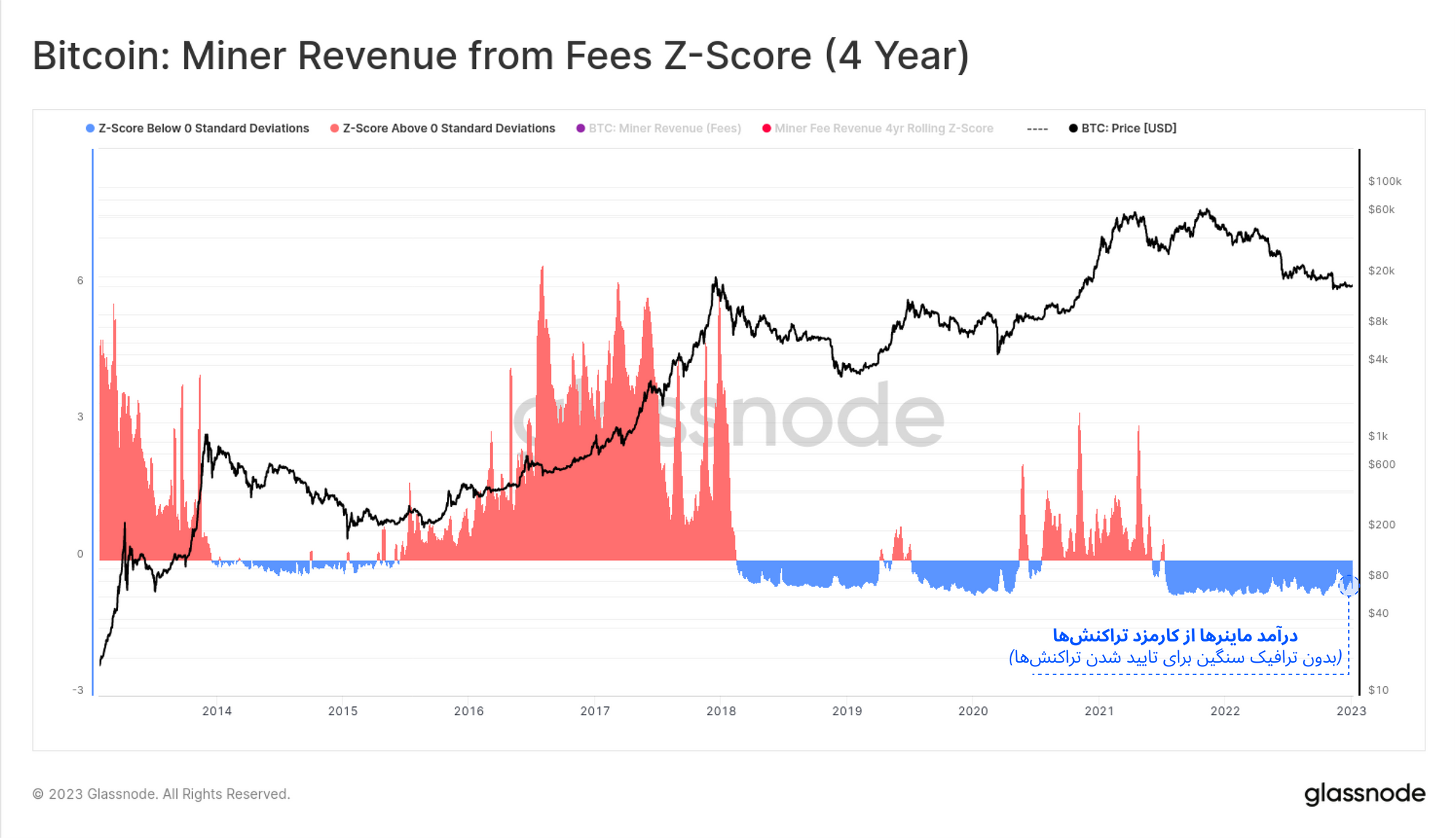 نمودار زیر میزان درآمد ماینرها را از کارمزد تراکنشها نشان میدهد. طبق این نمودار از افت درآمد ماینرها میتوان اینگونه برداشت کرد که کاربران برای جا دادن تراکنشهای خود در بلاکهای بیتکوین تقاضای چندانی ندارند و به همین علت در حال حاضر درآمد ماینرها از کارمزد تراکنشهای شبکه، زیر محدوده مورد انتظار قرار گرفته است.