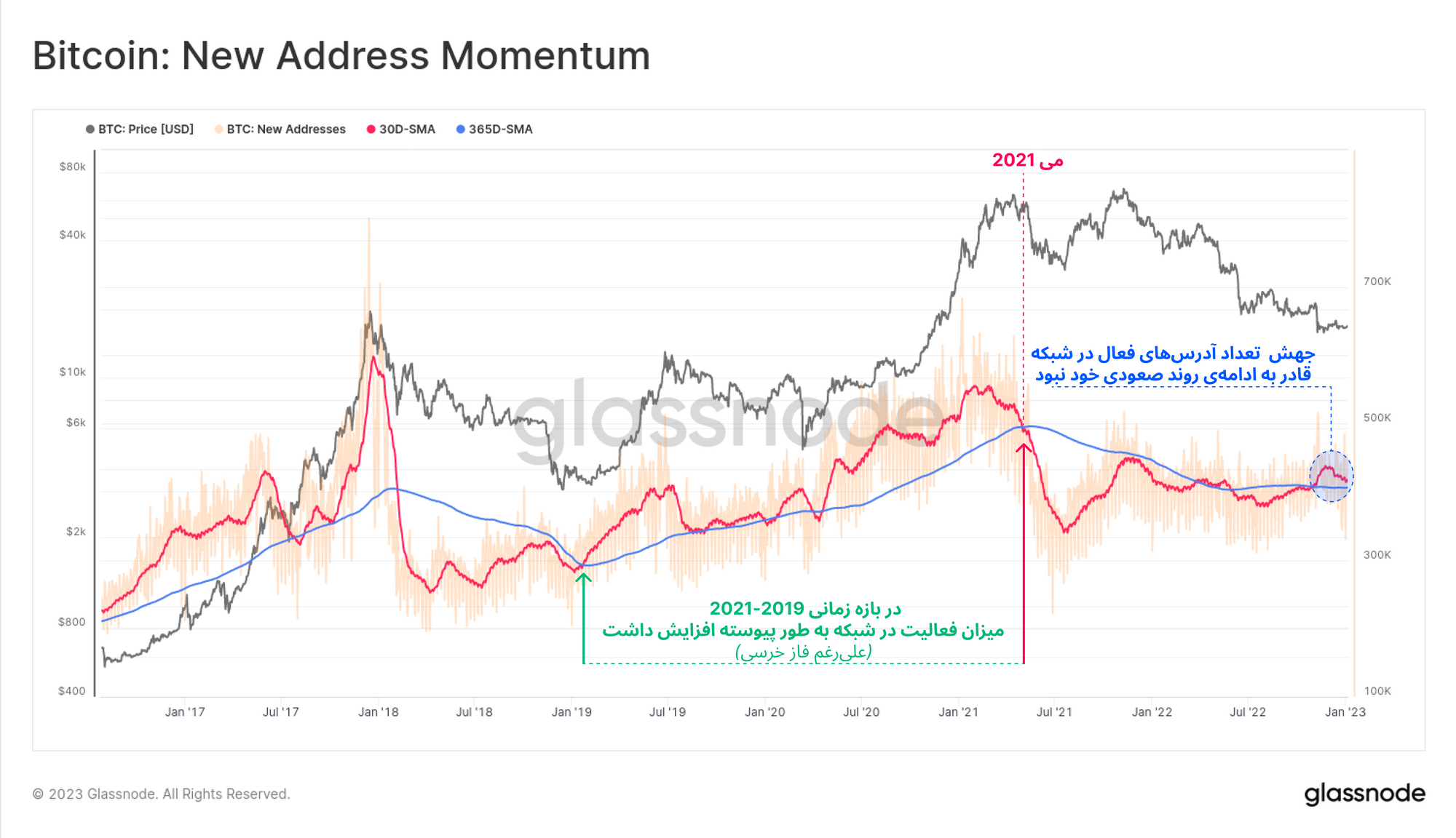 🔔 پیشنهاد تنظیم هشدار: در صورتی که معیار New Addresses (30D-MA) به زیر ۴۰۵ هزار آدرس فعال در روز برسد، این محدوده به معنای کاهش عمیق و آسیب جدی بخش کاربری شبکه خواهد بود.