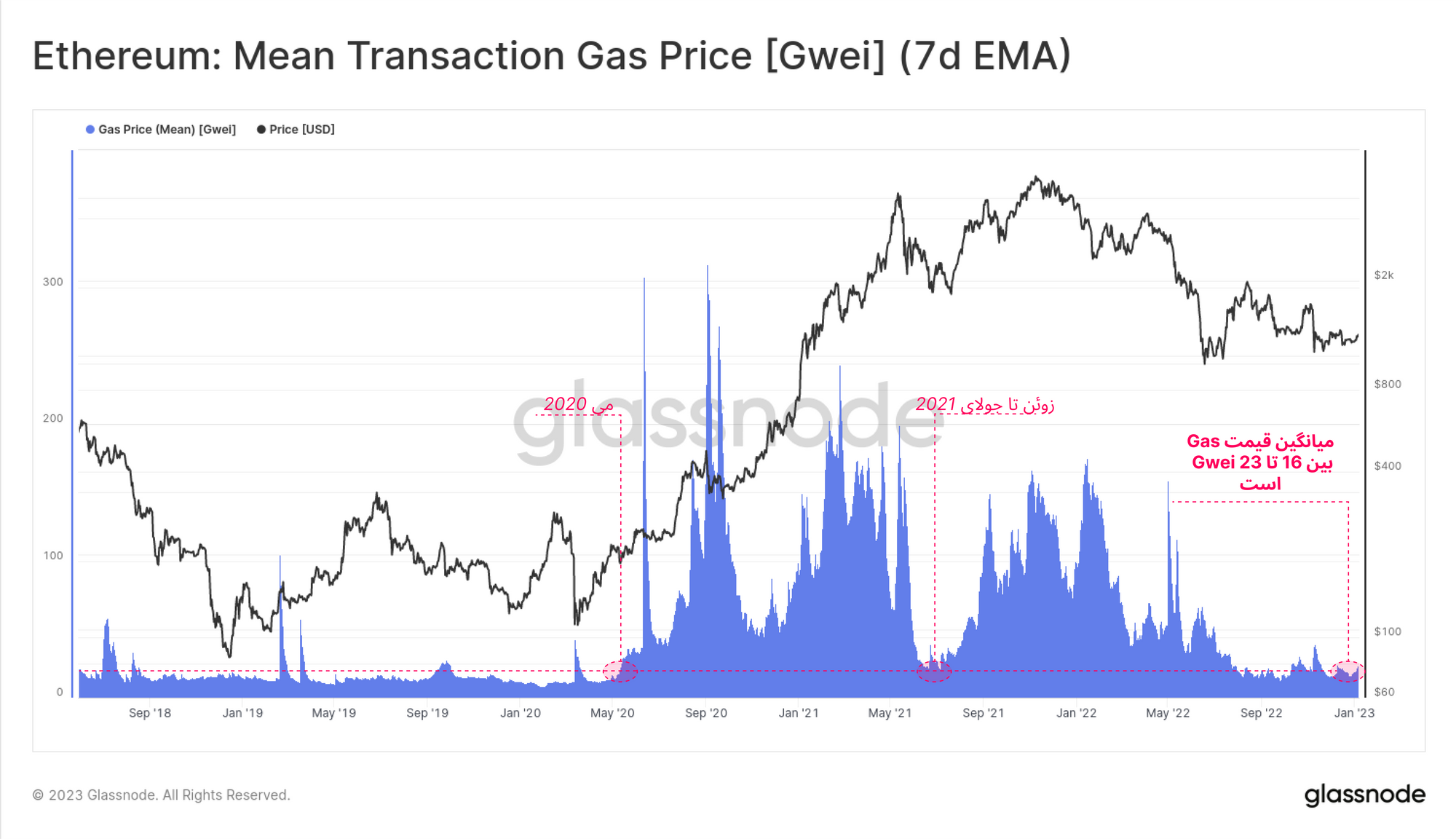 بیتکوین تنها شبکهای نیست که با کمبود فعالیت شدید مواجه شده است. نمودار زیر میانگین کارمزد Gas در شبکه اتریوم را نشان میدهد که طبق آن کارمزد Gas شبکه از ماه سپتامبر تاکنون بین ۱۶ تا ۲۳ Gwei بوده است و هنوز در نواحی پایین چرخه فعلی قرار دارد. در بازه زمانی ژوئن-جولای ۲۰۲۱ و ماه می ۲۰۲۰، درست پس از فروپاشی بازار بر اثر اخبار COVID، میانگین کارمزد Gas به این نواحی دست یافته بود.