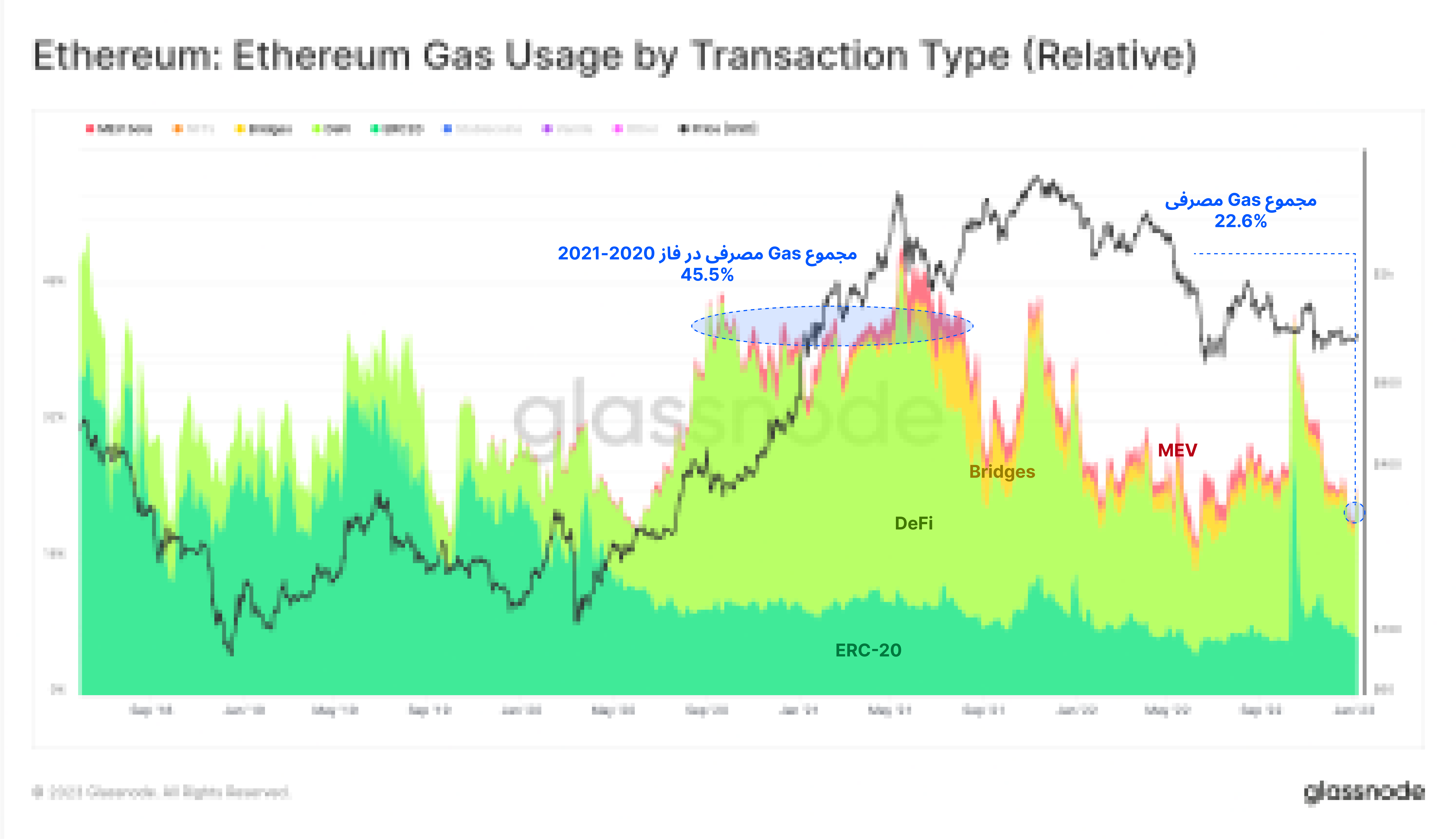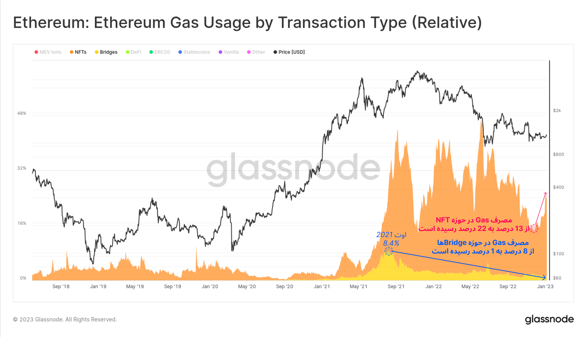 حوزه NFT ها توجهات بسیاری به خود جلب کرد و موجب افزایش حجم کاربری در شبکه اتریوم شد. NFTها در سال ۲۰۲۲ از مصرف Gas شبکه سهم عمدهای داشتند که این سهم اخیرا از ۱۳ درصد به ۲۲ درصد رسیده است.