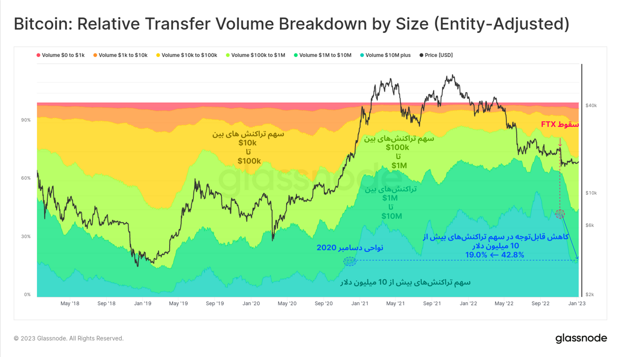 این نمودار تراکنشهای موفق شبکه بیتکوین را به تفکیک حجم آن مشخص و گروهبندی کرده است. طبق نمودار مشاهده میکنید که کاهش سهم تراکنشهایی که بیش از ۱۰ میلیون دلار حجم داشتند، مهمترین علت افت حجم مبادلات دلاری در شبکه بوده است. سهم این گروه از تراکنشها قبل از ماجرای صرافی FTX، حدود ۴۲.۸ درصد بود، اما در حال حاضر ۱۹ درصد از حجم مبادلات دلاری شبکه را تشکیل میدهد.