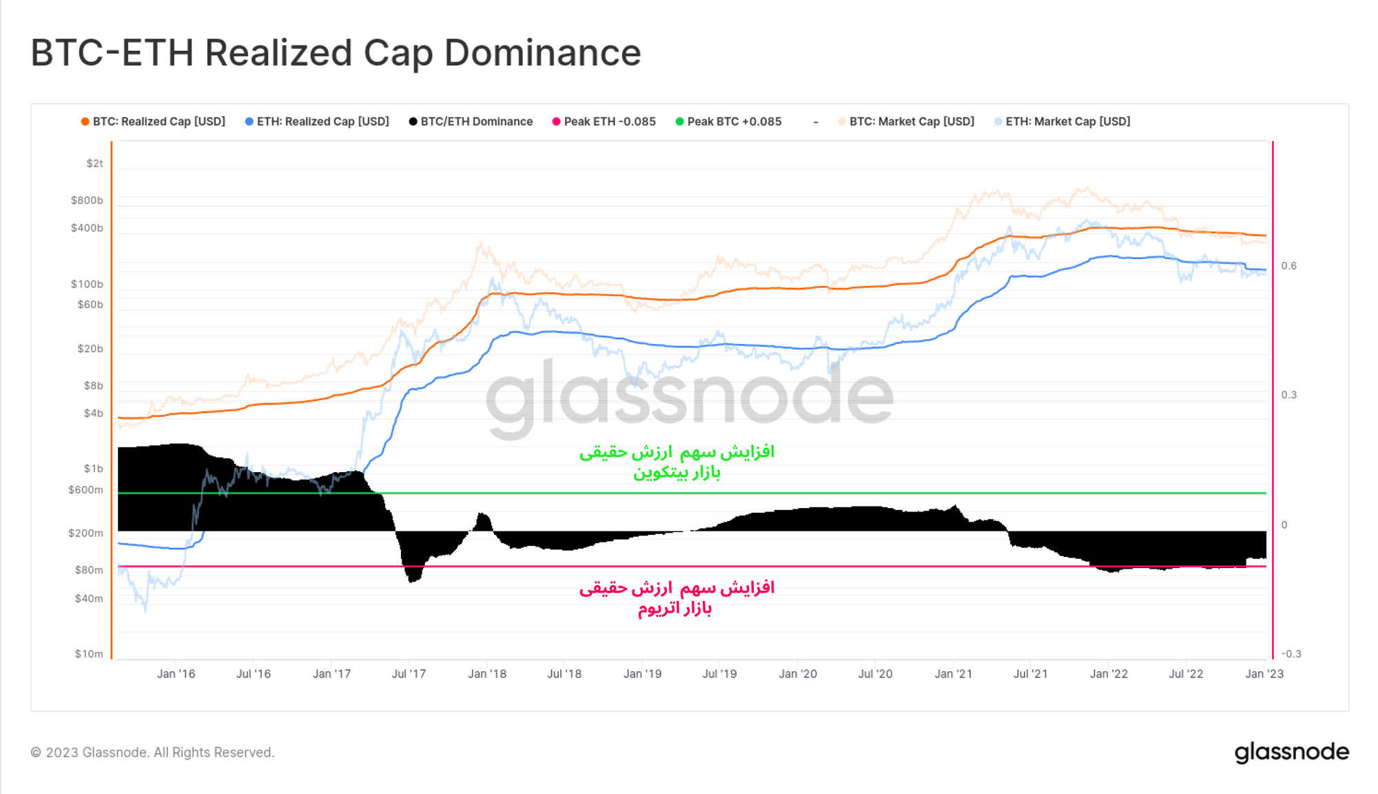 در نمودار زیر به جای Market Cap Dominance (سهم ارزش بازار که از مدتها پیش مرسوم بوده و به مشکلات آن در این بخش اشاره شد) ، طرحی ساده از Realized Cap Dominance (سهم ارزش حقیقی بازار) را نشان داده است. این نمودار سهم ورودی و خروجی پول حقیقی از بازار بیتکوین و اتریوم را نمایش میدهد.