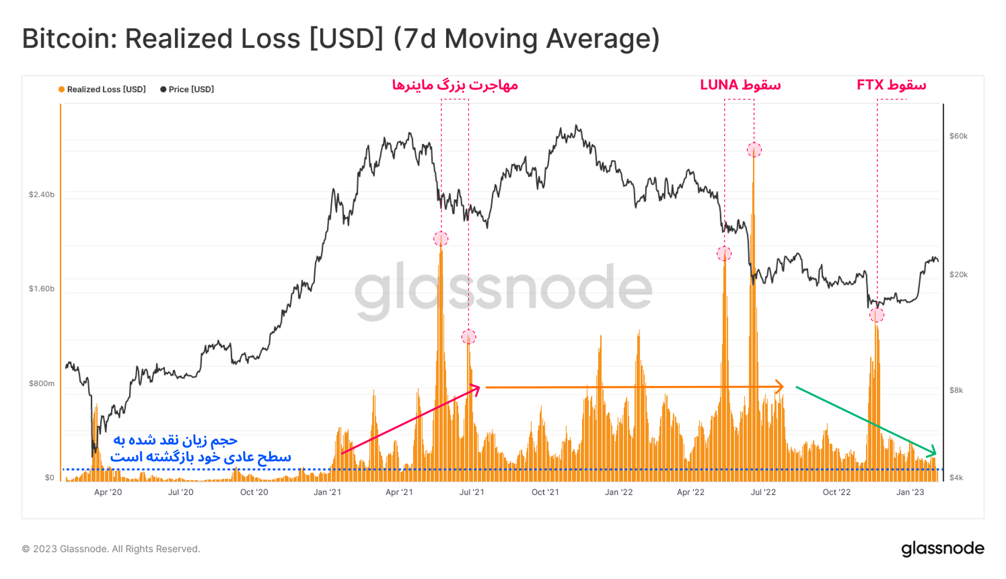 با این حال حجم زیانی که در حال حاضر در معاملات بازار نقد میشود، به تدریج به محدوده عادی خود، یعنی روزانه ۲۰۰ میلیون دلار کاهش پیدا کرده است و به طور کلی روندی نزولی در میزان زیانآوری بازار پدیدار شد. البته حجم زیانی را که هنگام سقوط LUNA و FTX در معاملات بازار نقد شدند، باید جزء موارد استثنا در نظر گرفت.