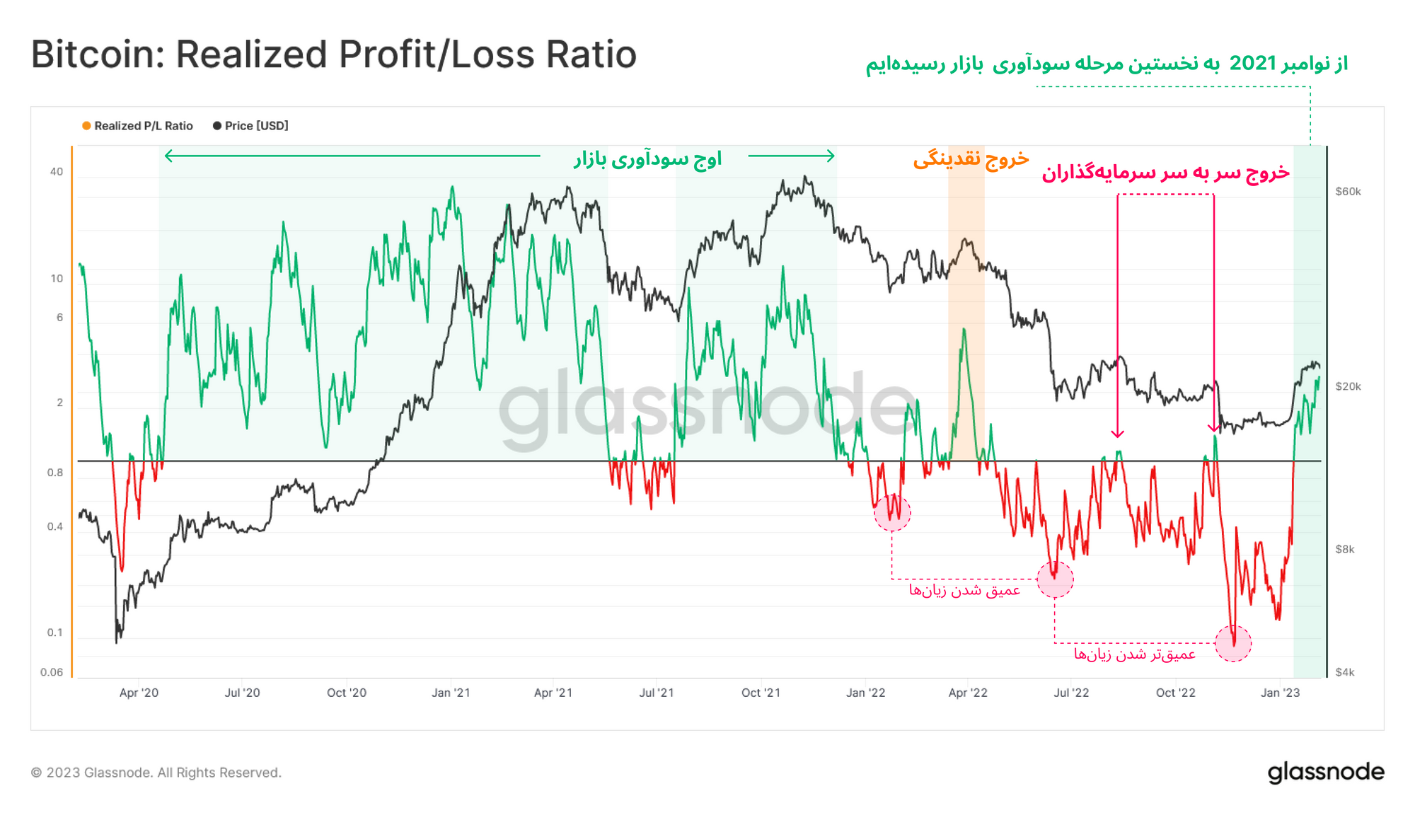 اگر نسبت میان حجم سود نقد شده و حجم زیان نقد شده بازار را ملاحظه کنیم، مشاهده خواهیم کرد که کدام یک از این جبهه بر بازار غلبه پیدا کردهاند. پس از ریزش ناگهانی قیمت در سقف قیمتی ماه می ۲۰۲۱، غلبه معاملات زیانآور به بازار آغاز شد. همچنین معیار Realized P/L که در نمودار زیر نسبت میان سود و زیان نقد شده را مشخص میکند، به زیر محدوده ۱ رسید و با هر ریزش قیمت، از این محدوده بیشتر فاصله گرفت.