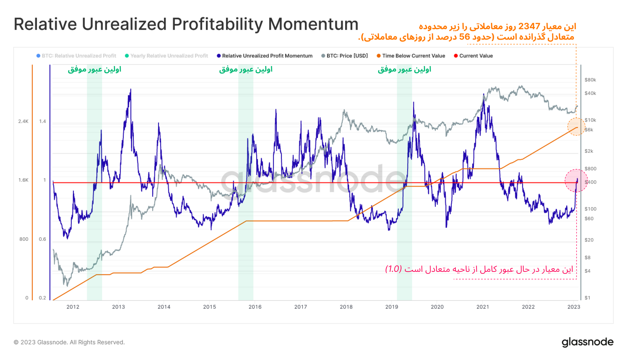 با نزدیک شدن این معیار🟠 به ناحیه متعادل خود، به نظر میرسد که در روند بازار تغییرات اساسی در حال شکلگیری باشد. از حرکت این معیارمیتوان اینگونه برداشت کرد که سرمایهگذاران بلندمدت تمایل بیشتری برای خرج کردن بیتکوینهای خود و انجام معاملات یافتهاند.همانطور که مشاهده میکنید، زمانی که این معیار در چرخههای قبل موفق به عبور از ناحیه متعادل خود شده، بازار ازحالت انفعال و هولد بیتکوینها، به سودآوری بالا تغییر حالت داده است و همچنین سرمایه موجود در بازار از سرمایهگذاران قدیمی به دست سرمایهگذاران جدید و ریسکپذیرتر انتقال یافته است.