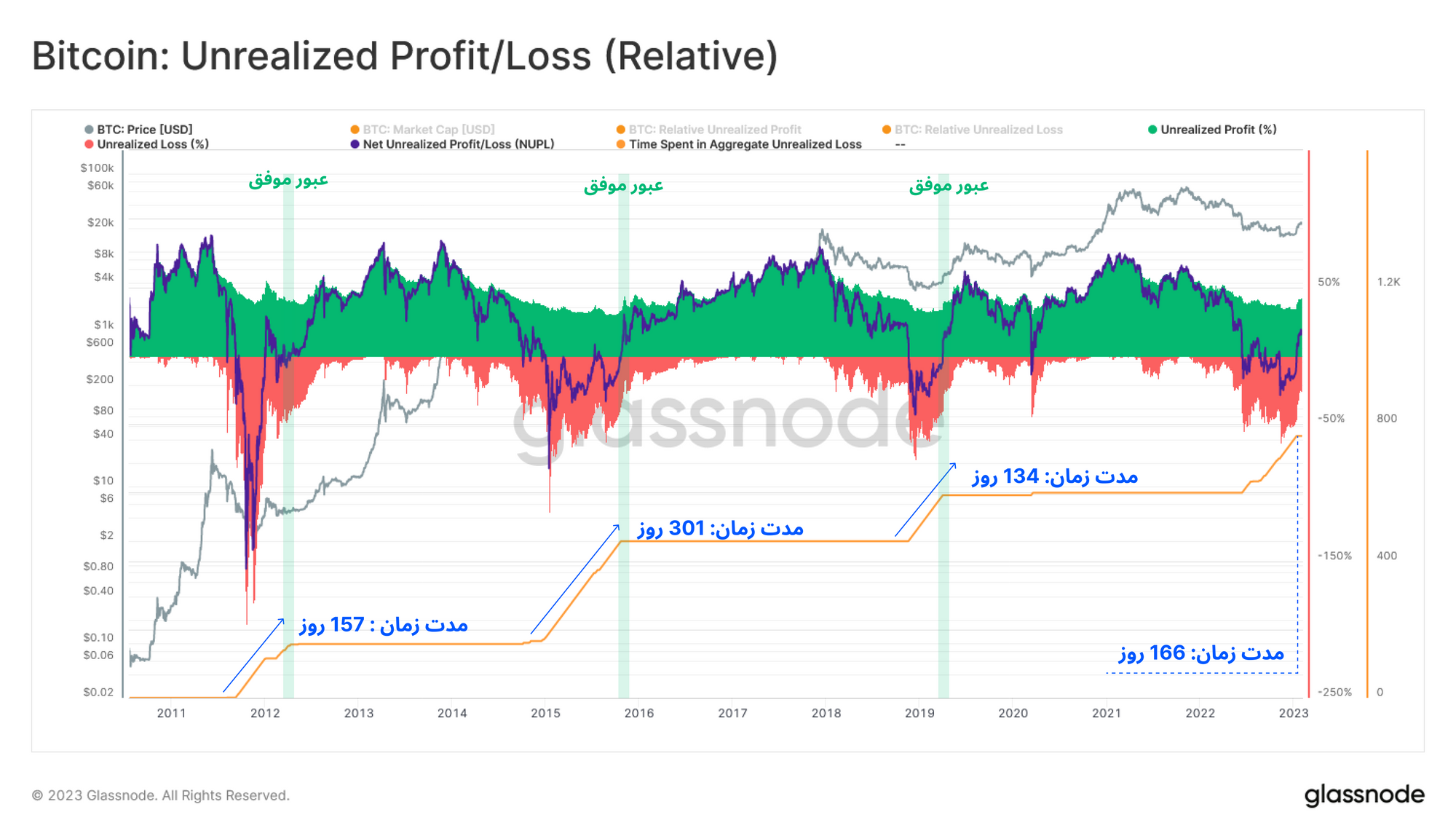 بیتکوین با عبور خود از میانگین قیمت خرید سرمایهگذاران مختلف بازار، موجب کاهش فشارهای مالی و بهبود شرایط سرمایهگذاران شد. این معیار 🔵 هماکنون در حال تلاش برای عبور کامل از محدوده متعادل خود است. اگر به چرخههای نزولی قبل توجه کنیم، شباهت بسیاری در تجدیدقوای بازار میان چرخه نزولی ۲۰۱۵، ۲۰۱۸ و چرخه فعلی مشاهده میکنیم. طبق رفتار چرخههای قبل، زمانی که این معیار به طور کامل موفق به عبور از این محدوده متعادل شده، جهت بازار نیز به طور کلی تغییر یافته است.