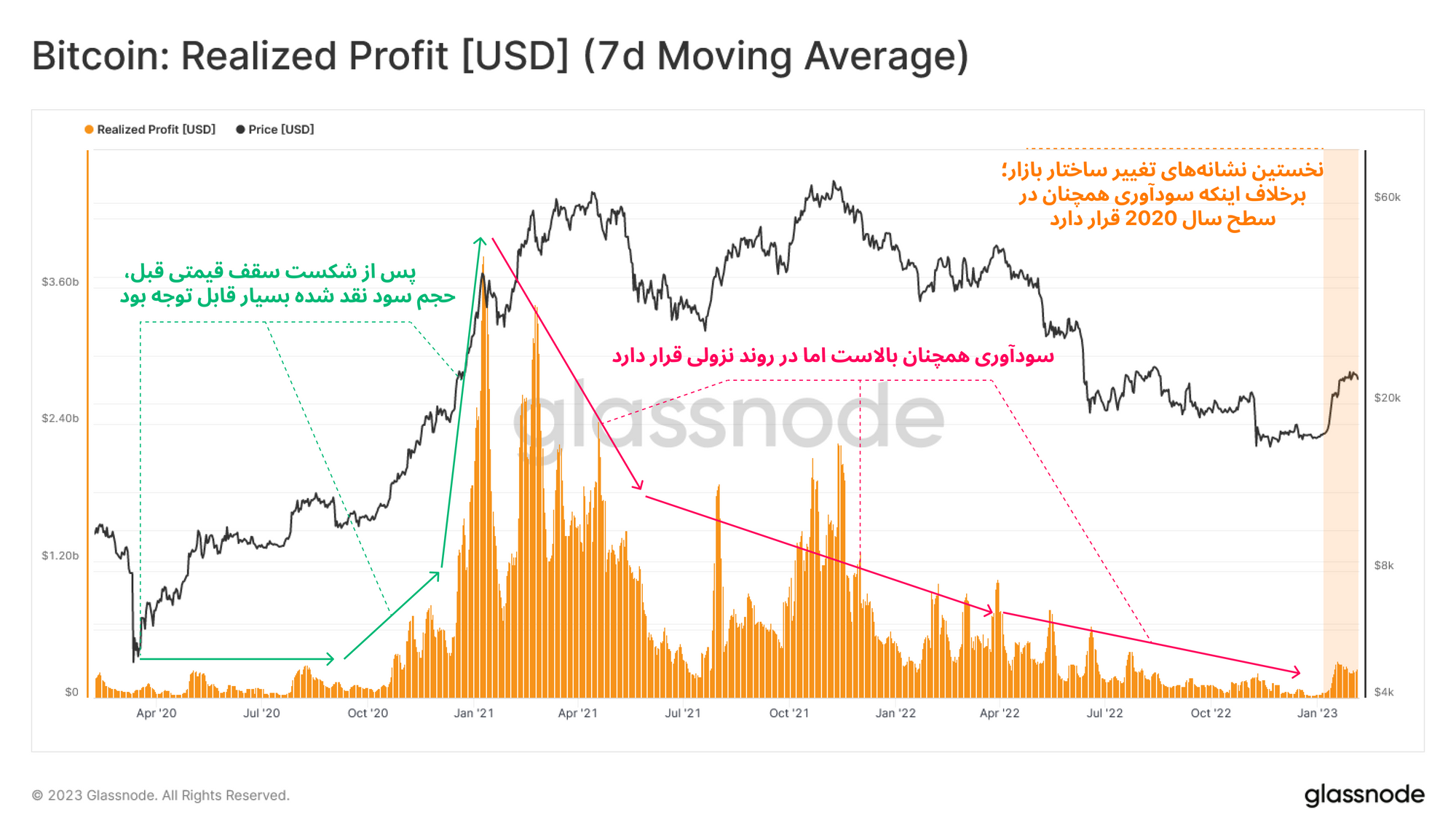 در ابتدا به میزان سود دلاری که در معاملات چرخه قبلی بازار نقد شده است میپردازیم. همانطور که مشاهده میکنید، به دلیل سیاستهای انبساطی پولی بیسابقه در سال ۲۰۲۰، پس از ماه اکتبر سرمایهگذاران سود خارقالعادهای در معاملات خود نقد کردند. به همین ترتیب از ژانویه سال ۲۰۲۱ این میزان سودآوری در معاملات ناگهان افت پیدا کرد و تا دو سال بعد، تمام سود حاصل شده مجددا از بازار پس گرفته شد.