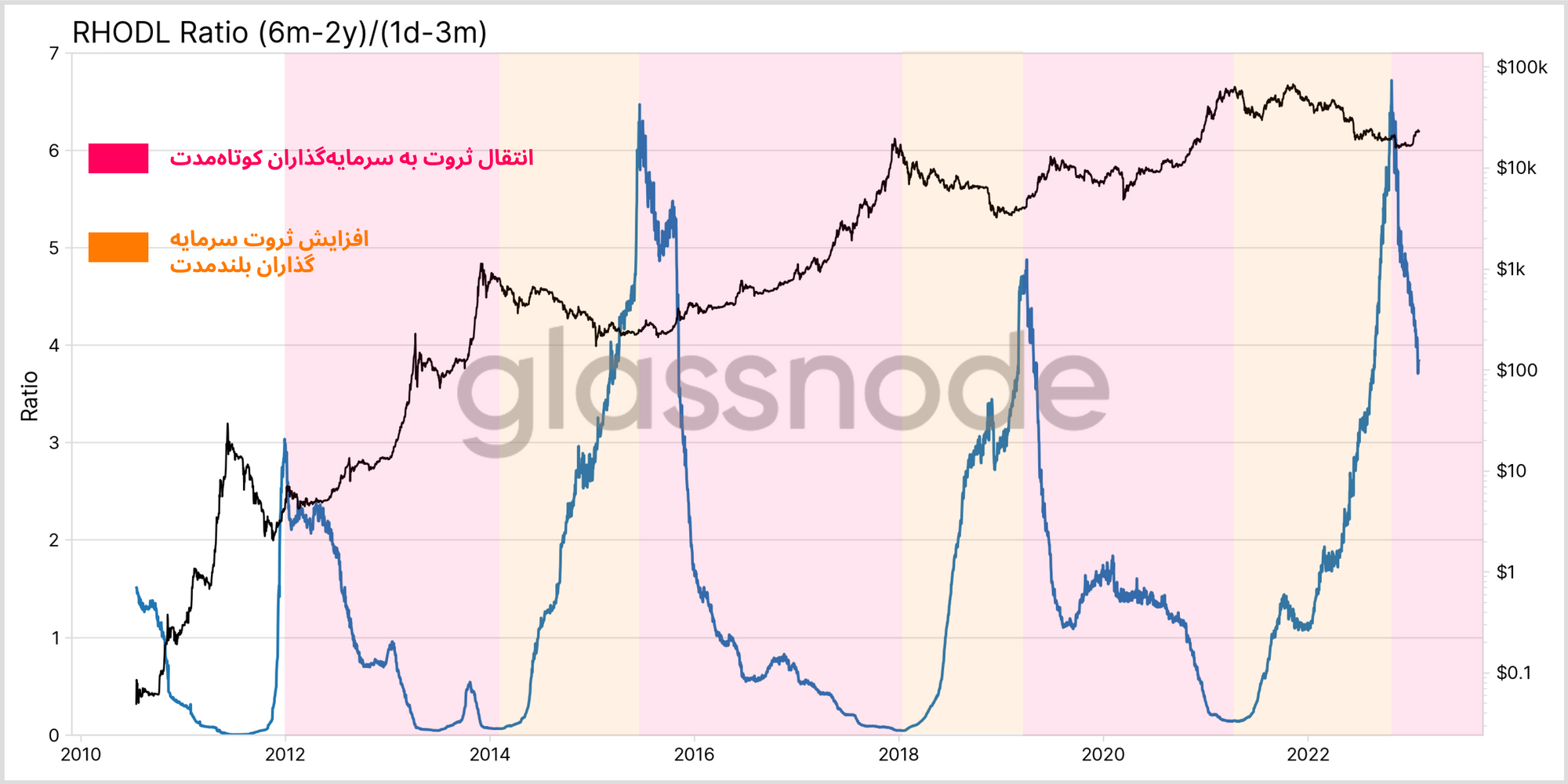 اکنون که تعادل میان ثروت سرمایهگذاران را مشاهده کردیم، به نسخهی دیگری از معیار قبلی میپردازیم. این نسخه از معیار، ثروت دلاری سرمایهگذاران بلندمدتی را که بین ۶ ماه تا ۲ سال بیتکوینهای خود را هولد کردهاند(تنها در یک چرخه حضور داشتند)، با ثروت سرمایهگذاران کوتاهمدتی که سن بیتکوینهایشان بین ۱ روز تا ۱ ماه است، مقایسه میکند و از این طریق نحوه انتقال ثروت بازار را در هر چرخه مشخص میکند.