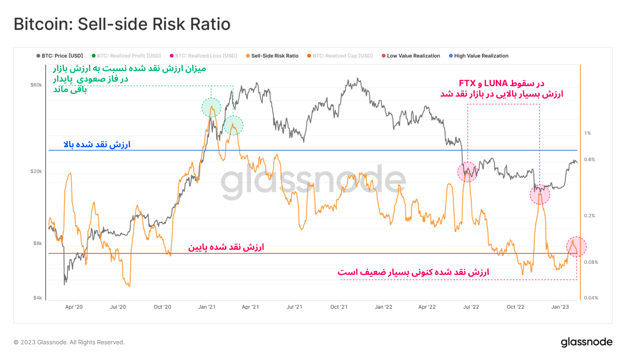 اگر از این دیدگاه به بازار توجه کنیم، مشاهده خواهیم کرد که مجموع سود و زیانی که اخیراً توسط سرمایهگذاران نقد شده، نسبت به ارزش بازار بیتکوین بسیار ناچیز است. بنابراین حجم معاملات سودآور و زیانآور اخیر بازار را نمیتوان با اوج سرخوشی سرمایه گذاران در فاز صعودی بازار و همچنین تسلیم آنها هنگام سقوط صرافی FTX مقایسه کرد.