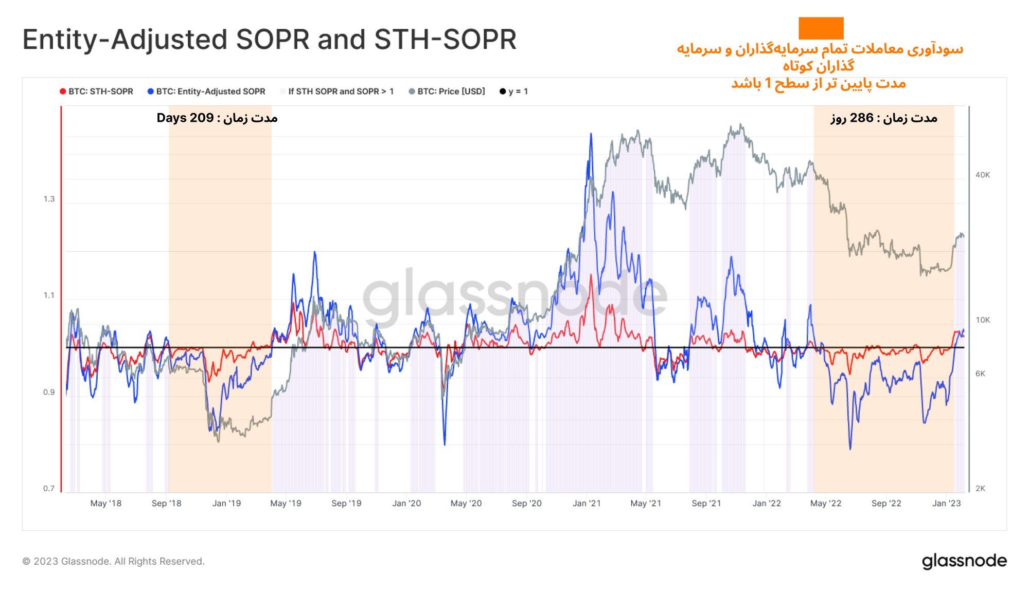 طبق سودآوری معاملات سرمایهگذاران کوتاه مدت 🔴 میتوان مشاهده کرد که اکنون این معیار به صورت پایدار در بالای سطح ۱ حرکت میکند. سرمایهگذاران کوتاهمدت پس از گذشت ۲۶۸ روز در ناحیه زیان آور، سرانجام از این ناحیه عبور کرده و دوباره به معاملات سودآور دست یافتهاند. همانطور که در نمودار مشاهده میکنید، این معیار آخرین مرتبه درماه مارس سال ۲۰۲۰ پس از گذشت مدت زمانی طولانی، موفق به عبور از سطح ۱ شده بود.