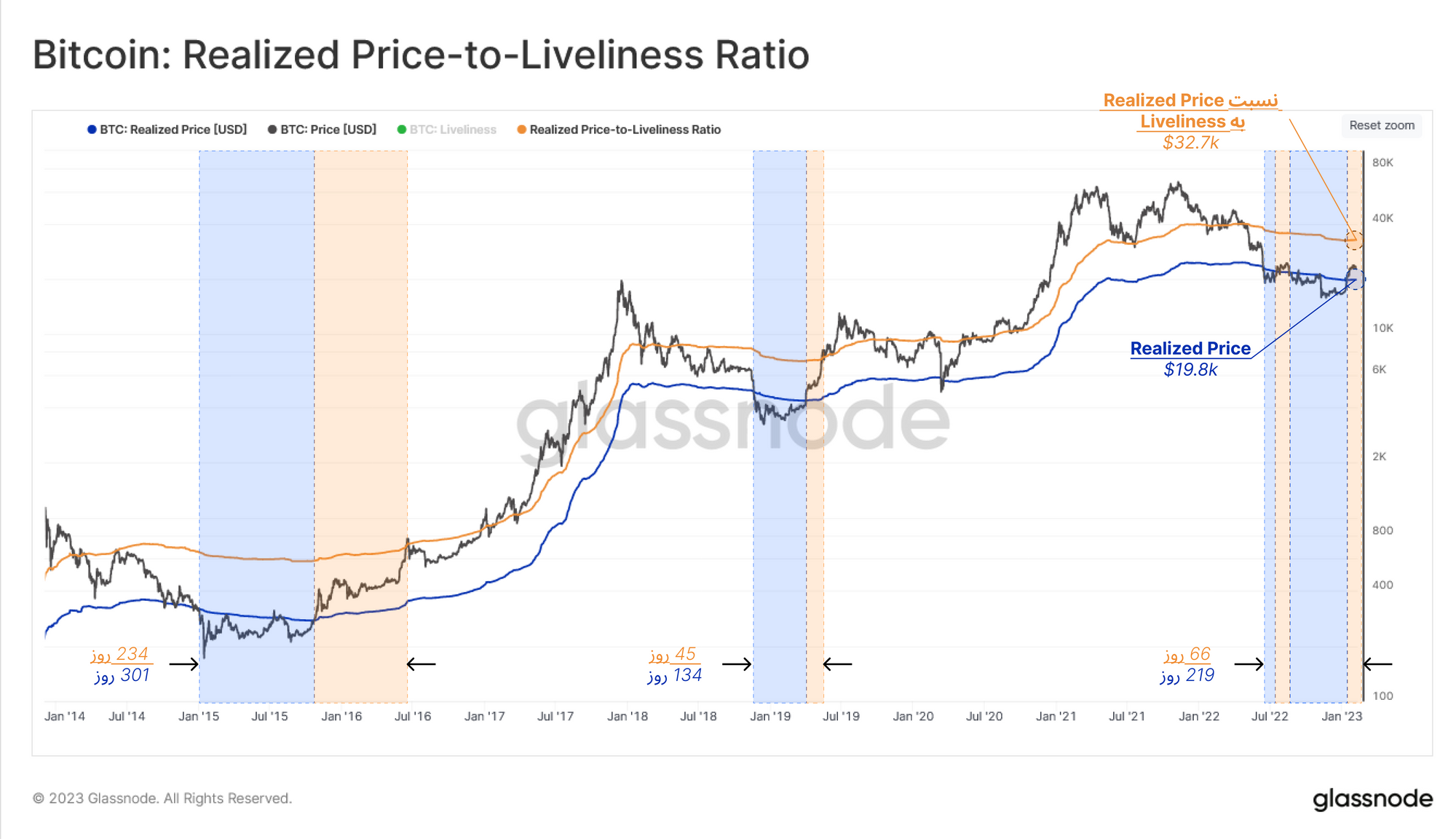 · معیاری که در محدوده بالای🟠 این ناحیه قرار دارد، نسبت میان معیار Realized Price و معیار Liveliness (۳۲.۷ هزار دلار) است که این معیار بر اساس میزان هولد کردن/خرج کردن افراد بازار، ارزش عادلانه بیتکوین را به صورت تخمینی مشخص میکند.