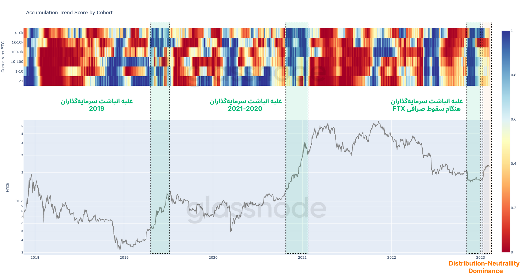اکنون با استفاده از نمودار زیر میزان انباشت و توزیع سرمایهگذاران مختلف را به صورت جزئیتر بررسی میکنیم. همانطور که مشاهده میکنید، تمام اقشار مختلف سرمایهگذار، پس از ماجرای صرافی FTX به صورت خالص به انباشت مشغول شده 🟩 و از طرف دیگر در طول چند هفته اخیر بیشتر در حال توزیع بیتکوینهای خود بودهاند🟧 .