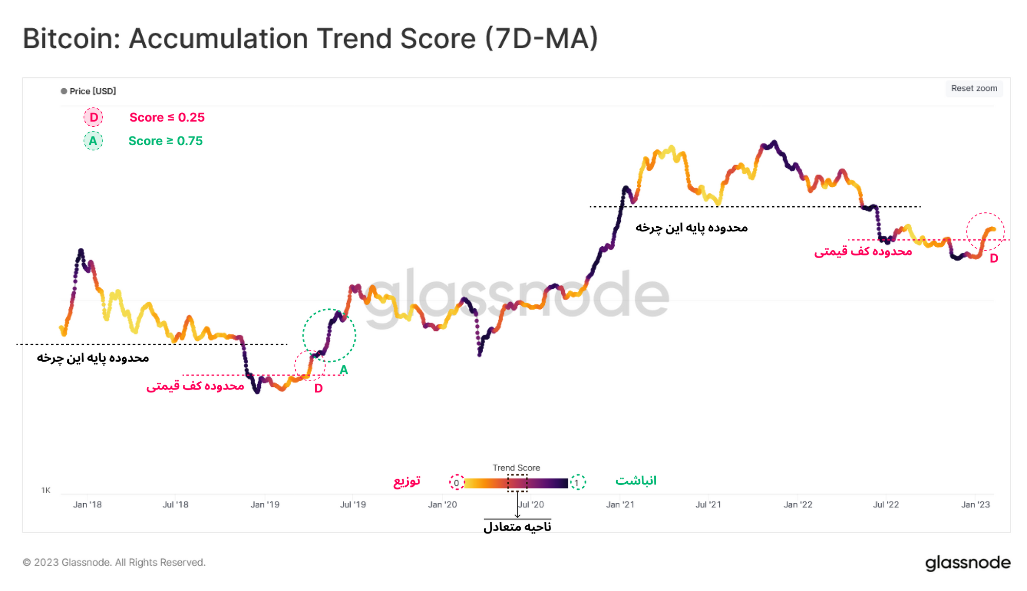 بنابراین بخشی از پایداری روند صعودی فعلی، منوط به ادامه انباشت سرمایهگذاران بزرگ است تا در نتیجه، این معیار مجدداً به مقدار ۱ تمایل پیدا کند(🟢A).
