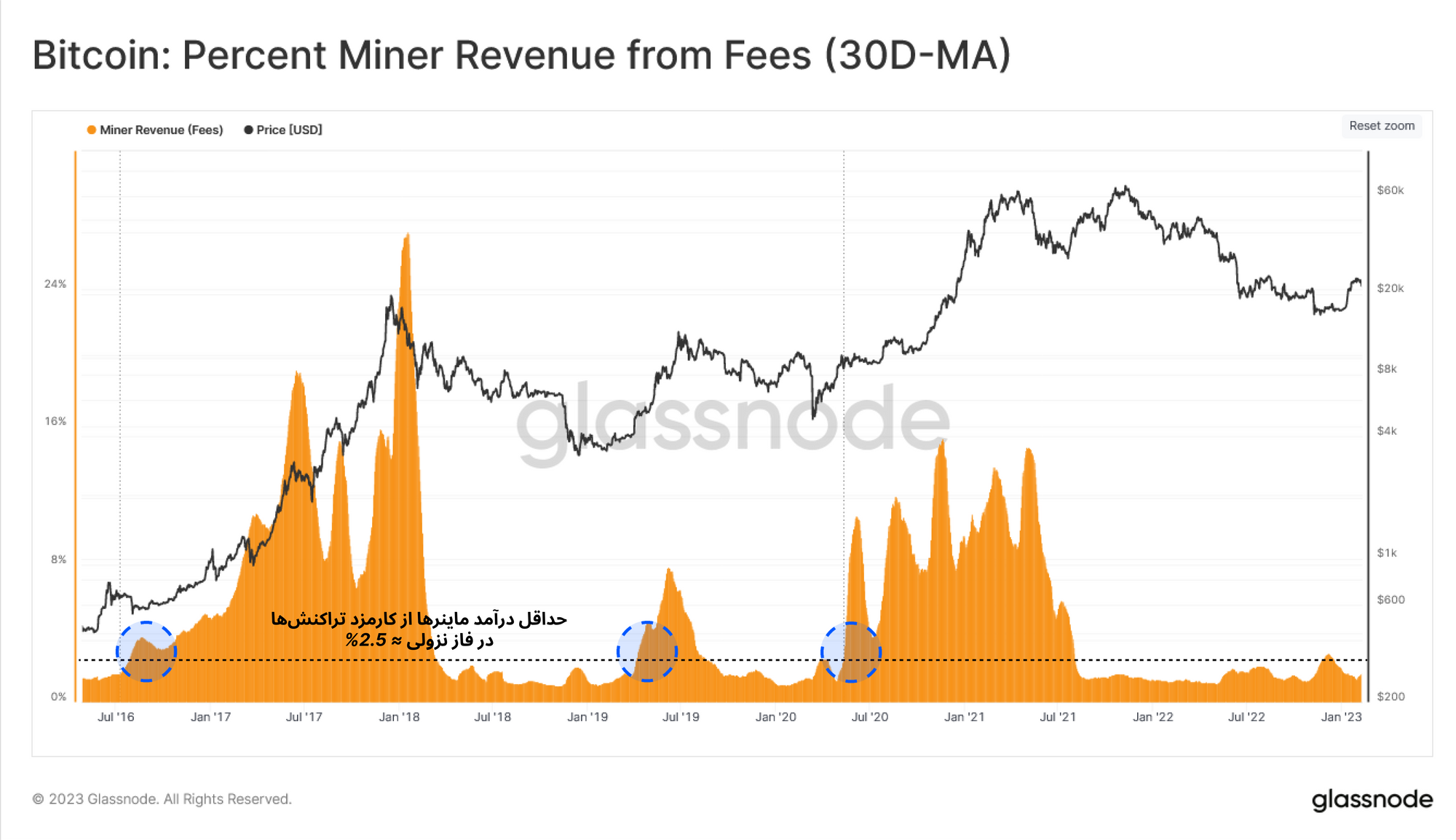 نمودار زیر میزان کارمزدی که ماینرها از تراکنشهای شبکه دریافت میکنند، نشان میدهد. در حال حاضر میانگین ماهیانه این معیار برای مدتی طولانی، قادر به عبور از ناحیه فاز نزولی خود (۲.۵ درصد🔵) نبوده است.