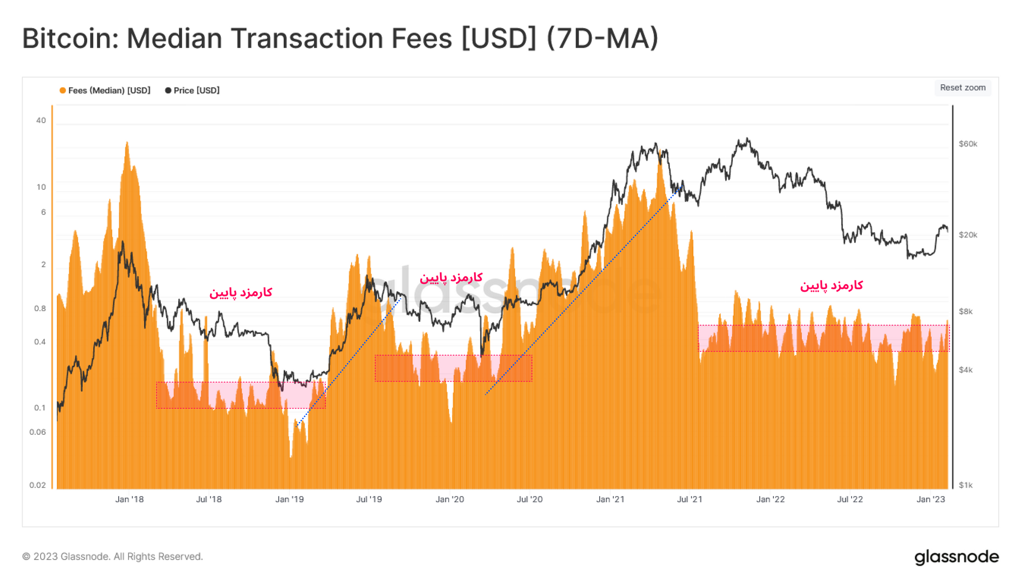 نمودار زیر کارمزدی که سرمایهگذاران خرد برای انجام تراکنشها در شبکه پرداخت میکنند، مشخص میکند. معمولاً سرمایهگذاران خرد در تغییر جهت بازار نقش مهمی ایفا میکنند؛ از این جهت میانگین هفتگی تراکنشهایی پرداختی (به صورت دلاری) آنها را بررسی میکنیم. این معیار صرفاً تراکنشهای کوچک شبکه را در نظر .میگیرد و این تراکنشها غالباً متعلق به سرمایهگذاران خرد هستند