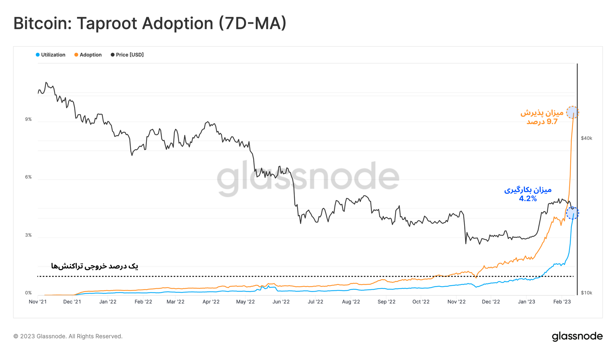 نمودار زیر میزان پذیرش و بکارگیری قابلیت Taproot را در تراکنشهای شبکه بیتکوین نشان میدهد. همانطور که مشاهده میکنید میزان پذیرش این نوع تراکنشها تا سقف ۹.۴ درصد، و میزان بکارگیری آن تا ۴.۲ درصد افزایش داشته است.