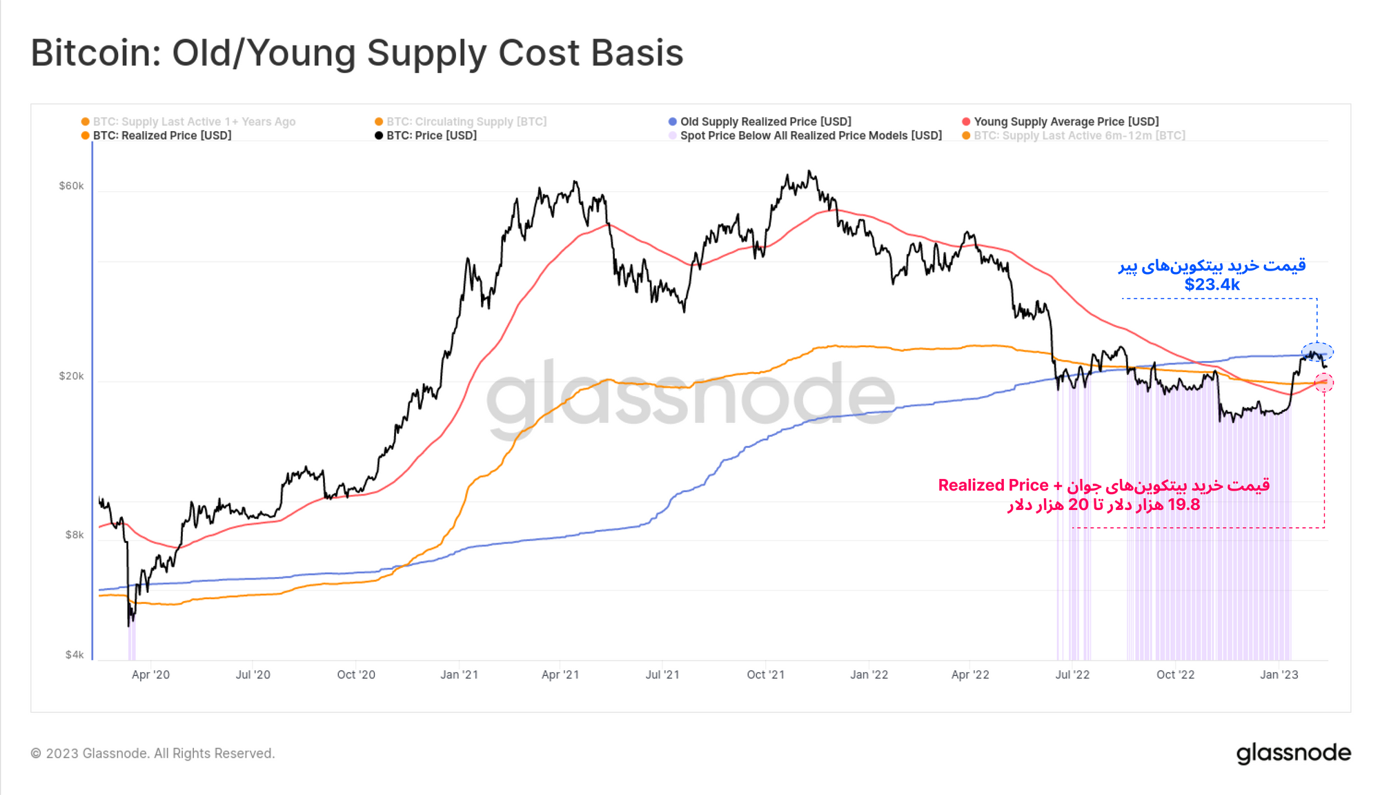 معمولا هنگامی که قیمت به سقف خود میرسد و در اصلاح قیمتی عقبنشینی میکند، رفتار فعالترین افراد بازار تاثیر مهمی در جهتدهی حرکت بازار دارد. همانطور که در نمودار زیر مشاهده میکنید، قیمت در سطح میانگین قیمت خرید سرمایهگذاران پیر (افرادی که بیش از ۶ ماه بیتکوینهای خود را هولد کردهاند🔵) متوقف شد و هماکنون در زیر این قیمت، میانگین قیمت خرید تمام افراد بازار 🟠 و همچنین میانگین قیمت خرید سرمایهگذاران جوان (افرادی که کمتر از ۶ ماه بیتکوینهای خود را هولد کردهاند🔴)، در سطح ۱۹.۸ هزار دلار تا ۲۰ هزار دلار قرار دارد.