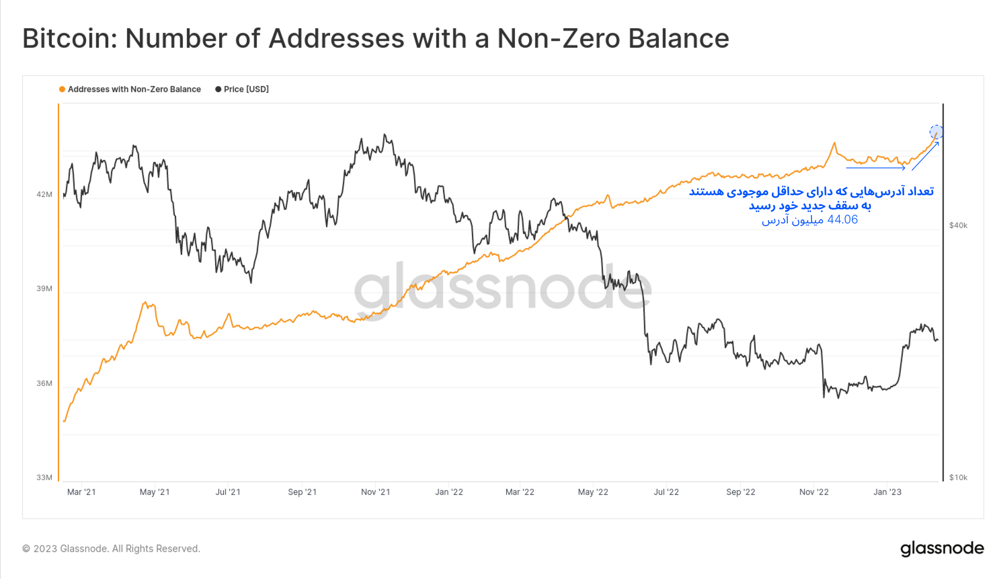 نمودار زیر تعداد آدرسهایی که دارای حداقل موجودی هستند، مشخص میکند. اخیرا تعداد این آدرسها به سقف جدیدی، یعنی حدود ۴۴.۰۶ میلیون عدد رسیده است. به طور کلی این افزایش در تعداد این نوع آدرسها نشان میدهد که اخیرا در میزان فعالیت کاربران شبکه افزایشی صورت گرفته است اما این تحرکات با انتقال بیتکوینهای بسیاری میان سرمایهگذاران همراه نبوده است. از این رو علت اصلی افزایش تحرکات در شبکه، ظهور Ordinals است که حجم وسیعی از دادهها و کاربران فعال شبکه را به خود اختصاص داده است.