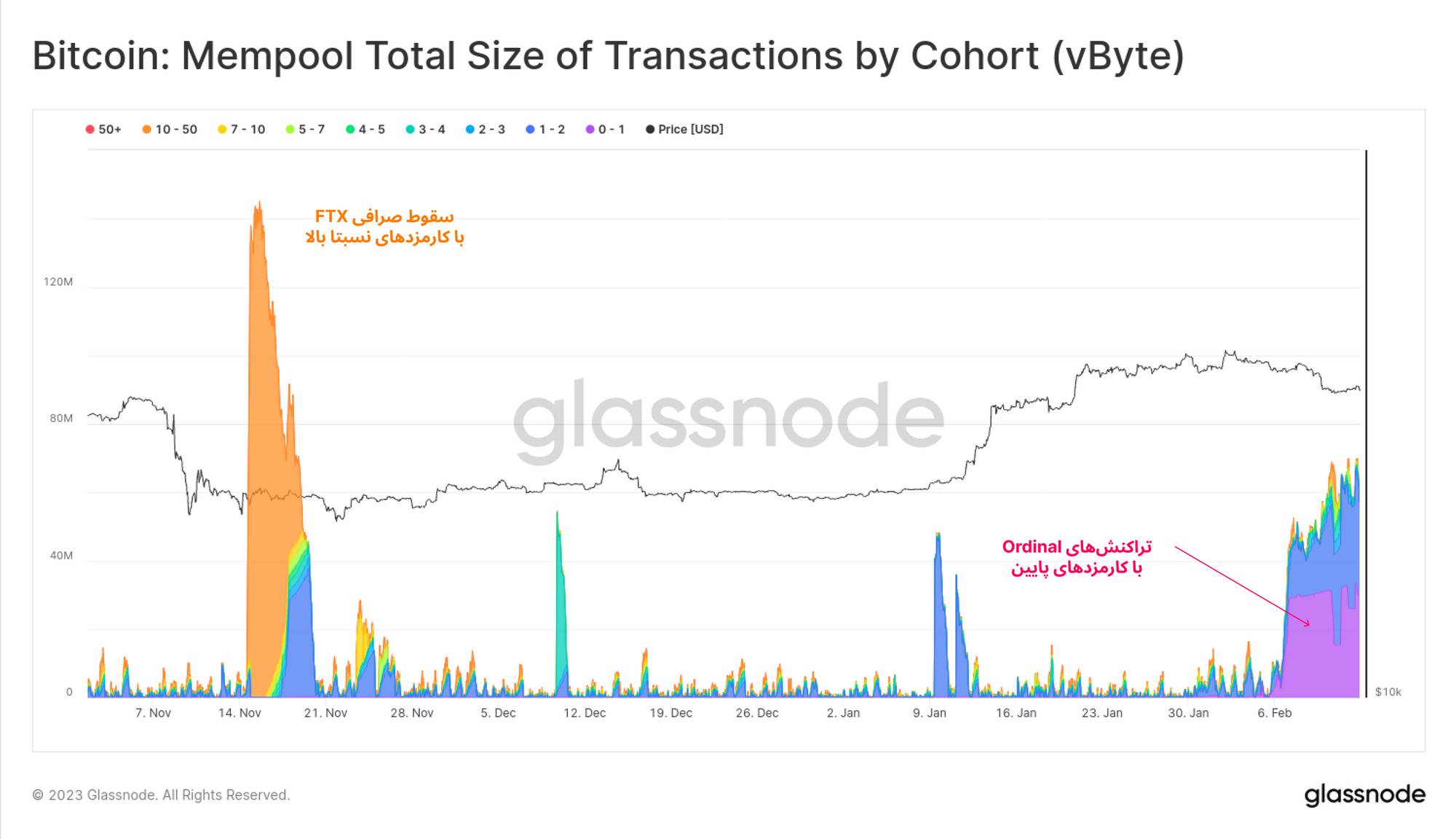 افزایش وزن بلاکهای شبکه، مباحث سازندهای را میان انجمن فعالان بیتکوین ایجاد کرده است؛ از جمله این مباحث، میتوان به تاثیرات بلندمدت Ordinals در وزن شبکه، مدت زمان راهانداری اولیه نود شخصی، شلوغی صف ممپول برای انجام تراکنشها و کارمزد تراکنشها، اشاره کرد. همانطور که مشاهده میکنید در قسمت بنفش نمودار🟣 تعداد زیادی از کاربران برای انجام تراکنش خود، کارمزدهای پایینی (بین ۰ تا ۱ ساتوشی/Vbyte) پرداخت کردند. در حالی که پس از ماجرای صرافی FTX، کاربران برای انجام هر چه سریعتر تراکنشهای خود به ممپول هجوم آورده و حاضر به پرداخت کارمزدهای بالاتری شدند (بین ۱۰ تا ۵۰ ساتوشی)🟠.