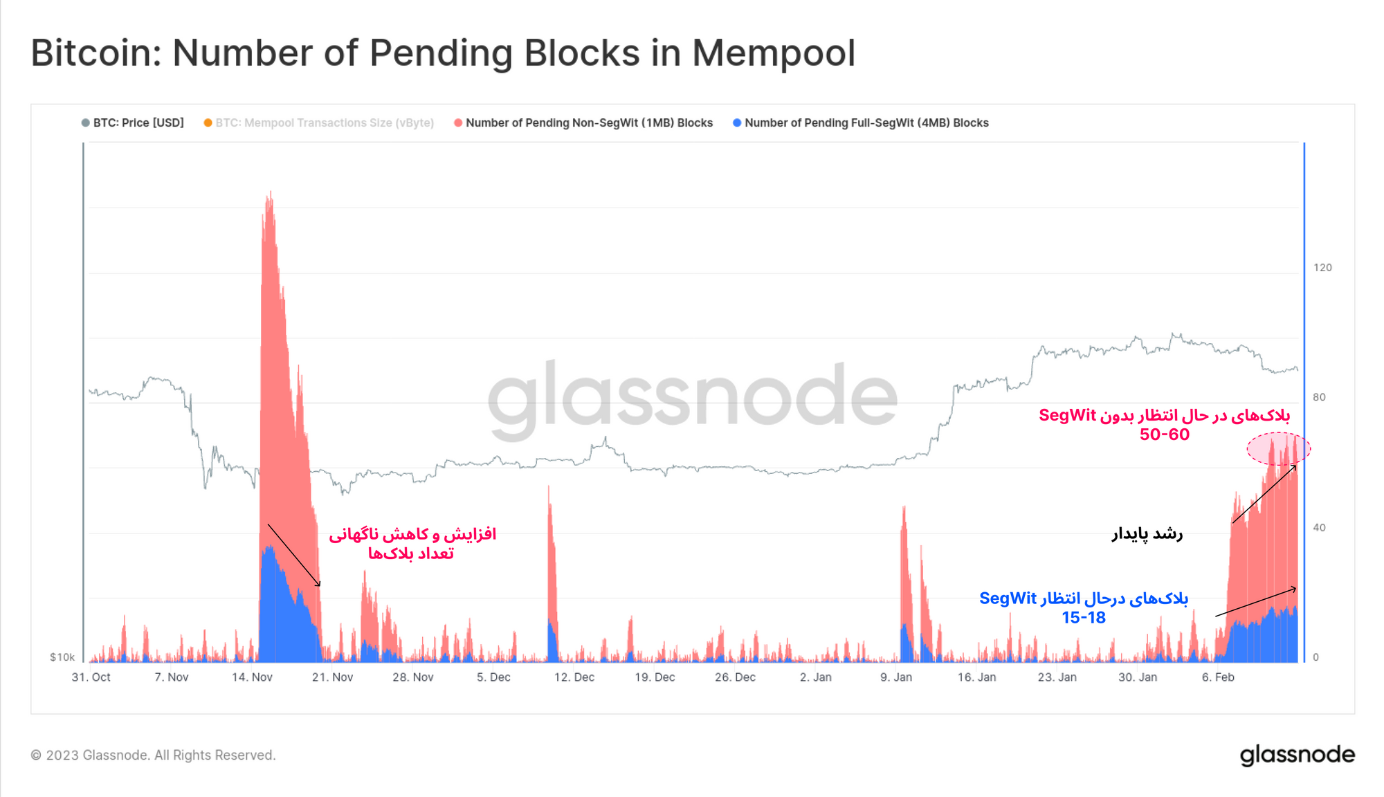 همچنین میتوانیم تعداد بلاکهایی را که در Mempool منتظر تایید شدن بودهاند، بررسی کنیم. در نمودار زیر تراکنشهایی که دارای قابلیت SegWit 🔴 و تراکنش هایی که بدون قابلیت SeqWit 🔵 باشند، مشخص شده است (SeqWit : قابلیتی برای حذف اطلاعات امضا از تراکنشهای بیتکوین به منظور افزایش ظرفیت بلاکها درشبکه). همانطور که مشاهده میکنید در هیاهوی صرافی FTX تعداد بلاکهای موجود در Mempool ناگهان افزایش یافته و پس از ثبات روانی سرمایهگذاران به یک باره تعداد این بلاک ها فروکش کرد. در حالی که با ظهور Ordinals در شبکه، روند تقاضا برای فضای بلاکها طی هفته اخیر پایدار بوده است و به تدریج رشد میکند.